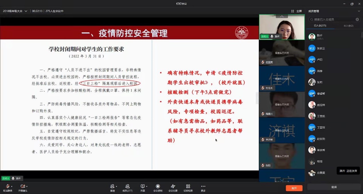 4月6日下午,yl6809永利官网召开2018级本科生疫情防控暨第三次毕业推进会。本次大会通过钉钉会议以网络视频的形式线上召开,2018级辅导员路乔主持会议,2018级全体毕业生参加。