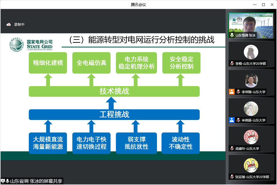 山东电力调度控制中心处长、正高级工程师张冰博士作了题为“能源结构转型下受端电网运行控制”的主旨报告。他从我国能源转型的背景、山东电网发展现状、系统运行面临问题及应对举措等四方面,介绍了当前能源结构转型下受端电网运行与控制面临的机遇与挑战,并回答了现场专家和学生的提问。