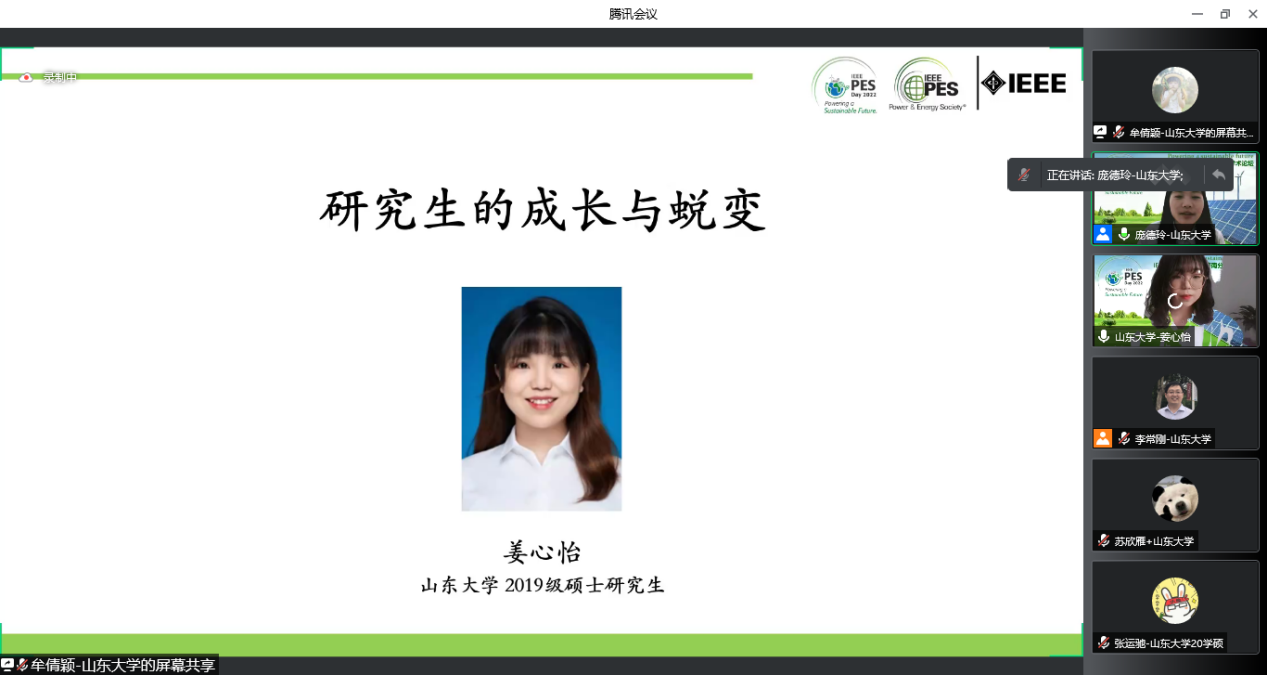 济南分会IEEE PES Day学生大使、山东大学2020级硕士研究生庞德玲主持后续报告和圆桌讨论环节。IEEE PES济南分会教育委员会主席、济南大学教授程新功,面向参会的本科生与研究生,作了题为“我的科研路径及思考”的主旨报告。他首先回顾了自己的科研道路,然后从同学们普遍遇到的科研困惑展开,针对理论研究与项目开发两种情况分别给出具体的科研方法,并总结了通用的科研建议。