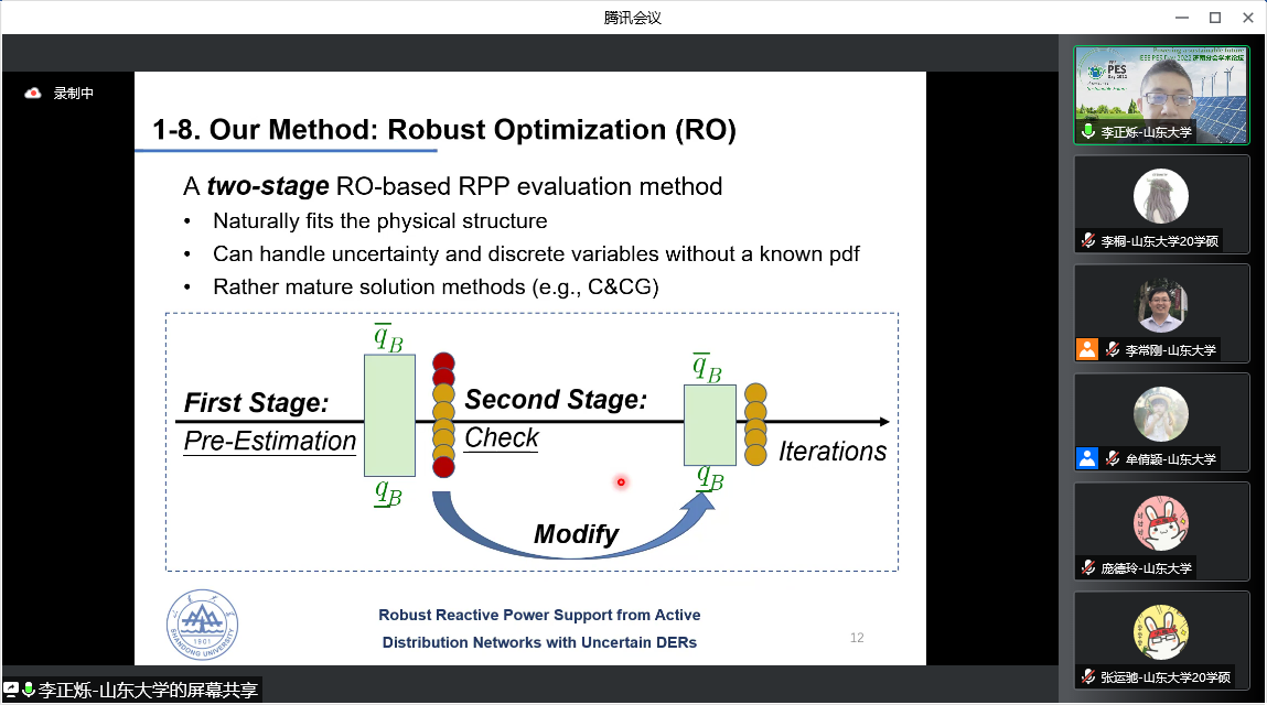 山东大学齐鲁青年学者李正烁教授作了题为“含不确定性分布式电源的主动配电网鲁棒无功可调度能力评估”的主旨报告。他从模型建立、求解方法、案例分析等几个方面介绍了主动配电网的无功支撑相关问题,与现场专家和同学们讨论了报告的思路与技术细节。