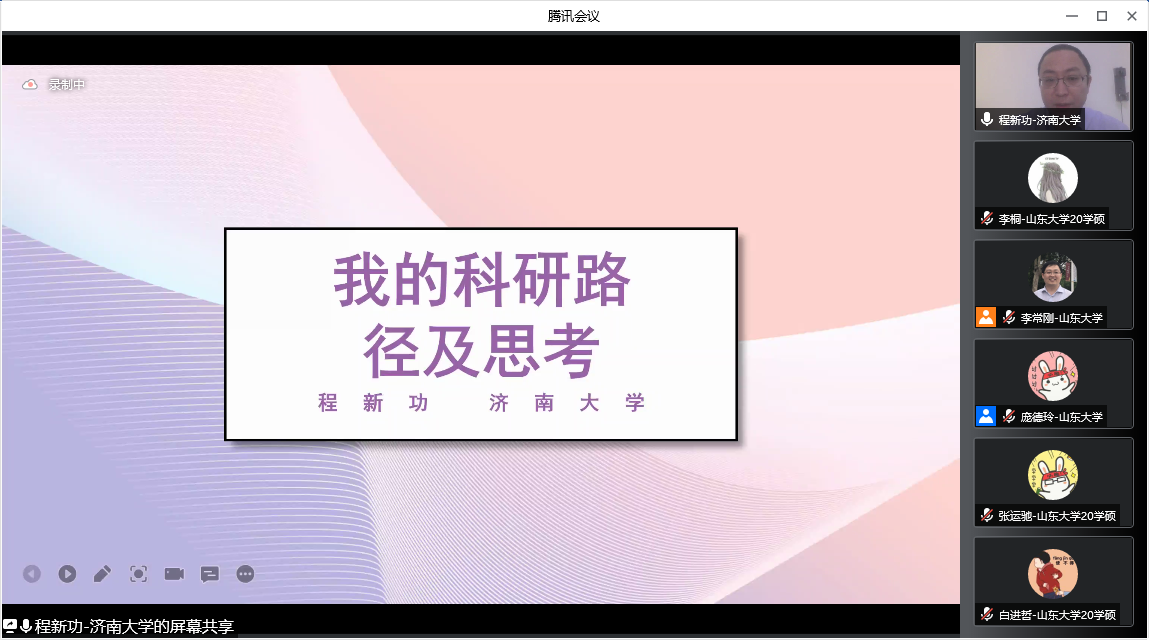 程新功教授主持了“启航之路”圆桌论坛,山东大学姜心怡、济南大学2019级硕士研究生王灼、2020级硕士研究生穆庆晟、中国石油大学(华东)2019级硕士研究生宁轲和青岛大学2019级硕士研究生李政洁共同参与圆桌讨论。线上同学们踊跃提问,与嘉宾们就如何平衡科研与社团活动、如何高效阅读文献、如何快速上手编程、如何在有限的文献中拓宽研究思路等问题展开讨论,为同学们进一步廓清了学习方法。