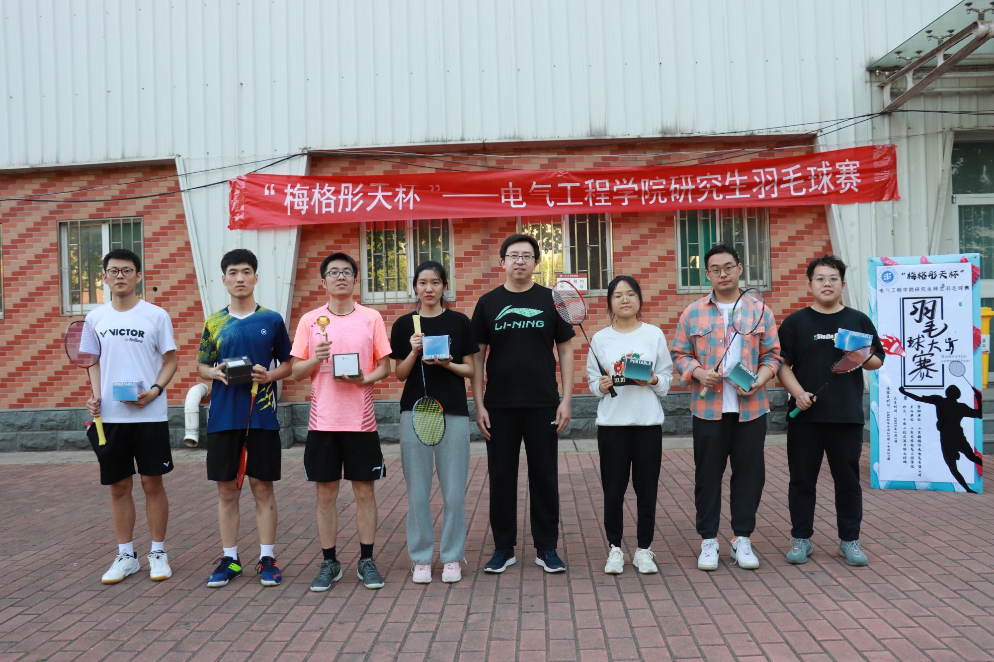 比赛结束后,学院党委副书记宋思利主持颁奖仪式并致辞,庆祝本次活动的圆满成功,向参赛队伍、赞助商伙伴——山东梅格彤天电气有限责任公司和赛事主办人员表示感谢,并鼓励同学们继续团结向上,努力拼搏。随后学院党委书记殷录民与院长丁磊为获奖队伍颁发奖杯和奖品,并合影留念。至此,本次研究生羽毛球比赛圆满结束。