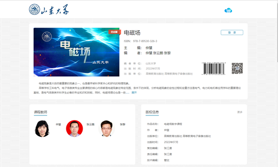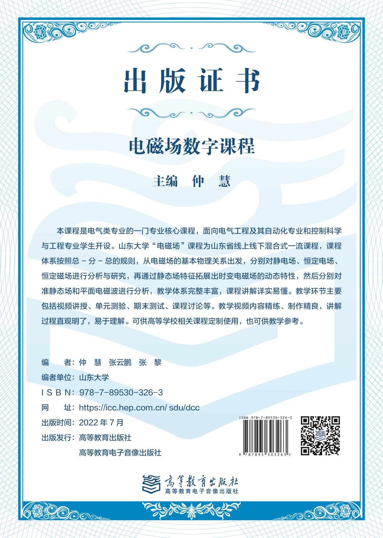 近日,yl6809永利官网仲慧副教授的新形态教材《电磁场数字课程》由高等教育出版社出版,作者为仲慧、张云鹏、张黎;山东大学为该书的独立作者单位。