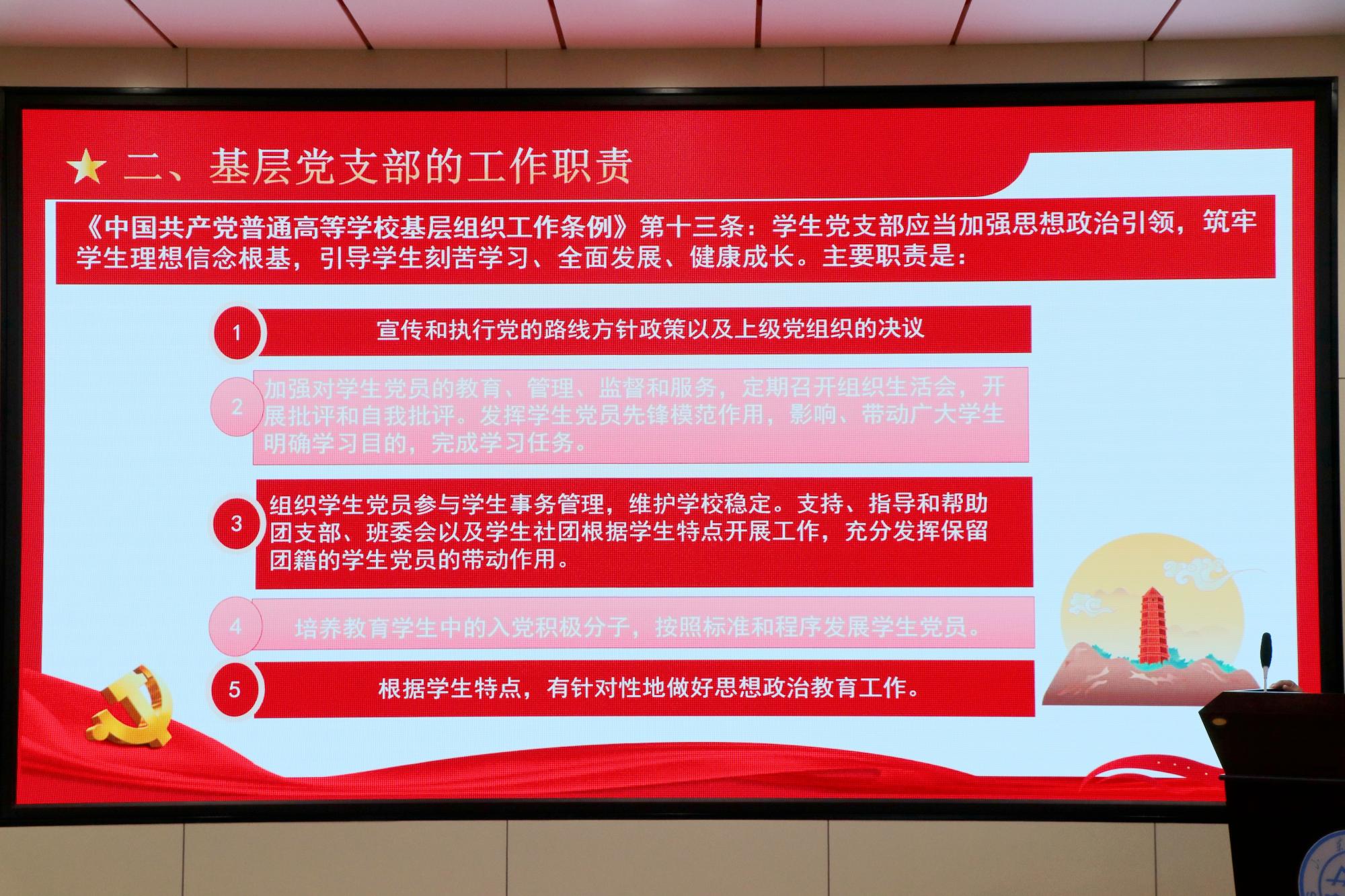 专题讲座针对高校师生党支部的特点和建设要求,立足学院工作实际,分别从党建政策依据、党支部工作职责、支部工作基本任务、党建工作创新、条件保障、加强警示教育等六部分内容全面阐述了基层党支部建设的目标要求和方式方法,并重点针对党支部的基本任务,从制定工作计划、开展组织生活、加强支部队伍建设、做好师德师风建设、党风廉政建设、严格落实疫情防控工作、标准化规范化做好支部档案资料等几个方面进行了培训指导。