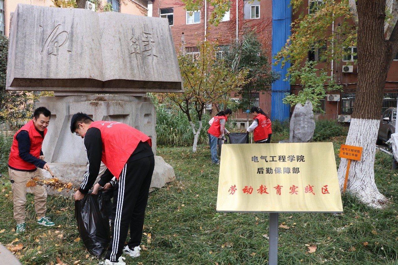 在后勤部老师的带领下,同学们一起进行了第一次劳动教育实践活动。老师和志愿者们分成两个小队,分别清扫5号楼南侧两处草坪里的杂物。草坪树叶分布复杂,不好收集到垃圾袋中。老师发挥模范带头作用,杨明老师以身作则,耐心教给同学们如何使用耙子聚拢草坪中的树叶。同学们认真听取后勤部老师的清扫经验,互帮互助,积极劳动,顺利完成了清扫任务,彰显了电气学子良好的团队合作精神。