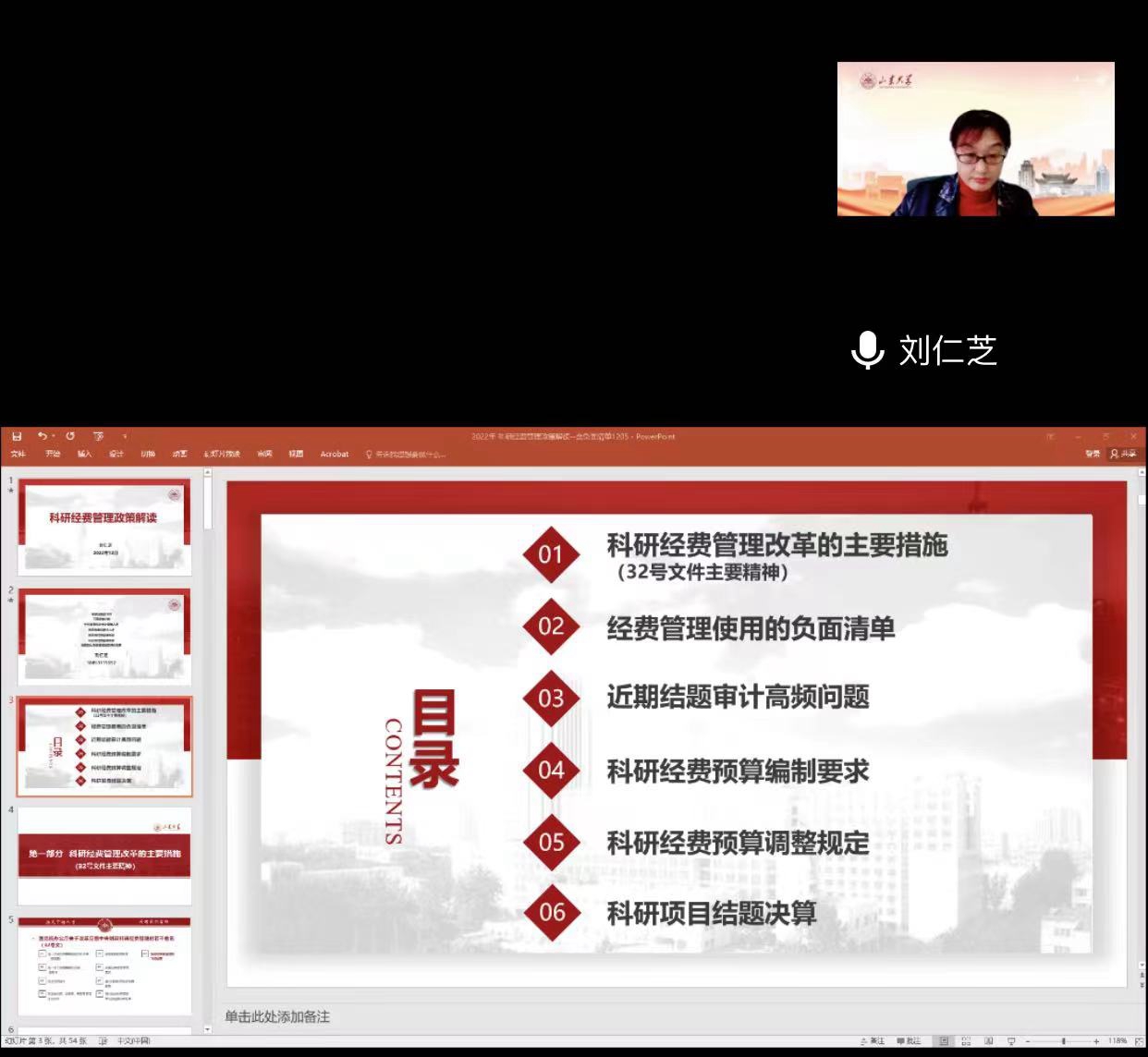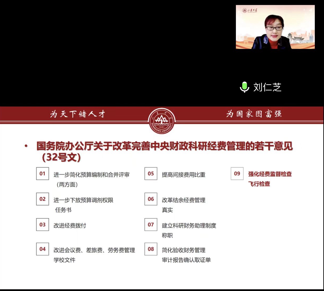 刘仁芝从科研经费管理改革的主要措施(32号文件主要精神)、经费管理使用的负面清单、近期结题审计高频问题、科研经费预算编制要求、科研经费预算调整规定、科研项目结题决算六方面详细解读了如何规范管理与使用科研经费。