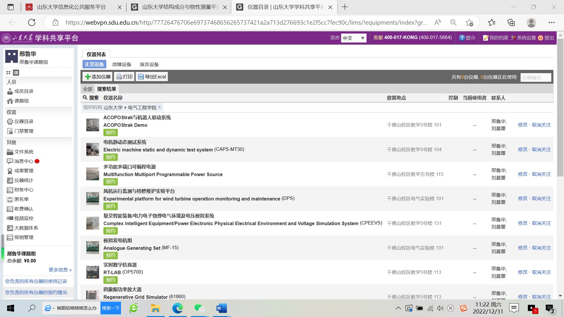 学院集中规划建设了“1+N”学科实验平台,并基于山东大学大型仪器公共技术平台,建立了电气工程学科实验平台管理系统,统一部署电子门禁、视频监控、消防系统,实现了门禁、监控、预约申请、使用权限的数据上网与联动。通过管理预约申请与门禁权限,精准管控实验室准入人员;通过主要设备上网共享预约,提高了设备使用效率;通过视频监控与消防联动系统,24小时掌握实验室运行状况,提升了实验室安全管理水平。