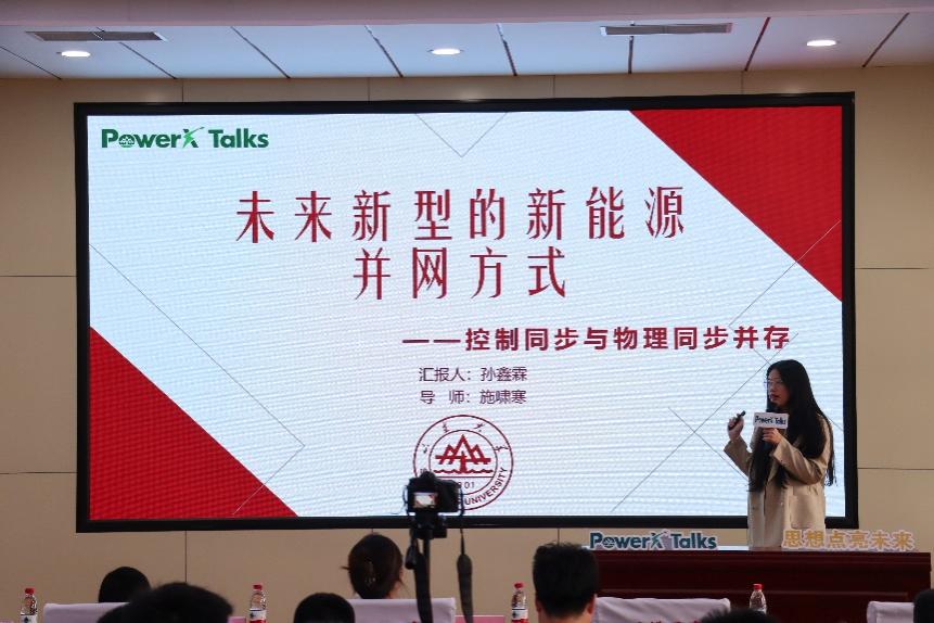 经过自主报名和前期选拔,本次活动由2022级硕士研究生孙鑫霖、沈义乔和陈阳三位同学进行学术分享。首先,孙鑫霖以“未来新型的新能源并网方式”为主题,提出一个通过电力电子变换器进行控制同步并网和借助同步发电机进行物理同步并网这两种并网方式并存的电网架构设想。她提到,现有的电力电子设备通过控制算法是很难支撑新能源为主体的新能源电力系统最终形态的,借助“同步电机对”进行物理同步并网作为一个可行、可控的并网方式,能够为电网的稳定运行提供更优良的特性。