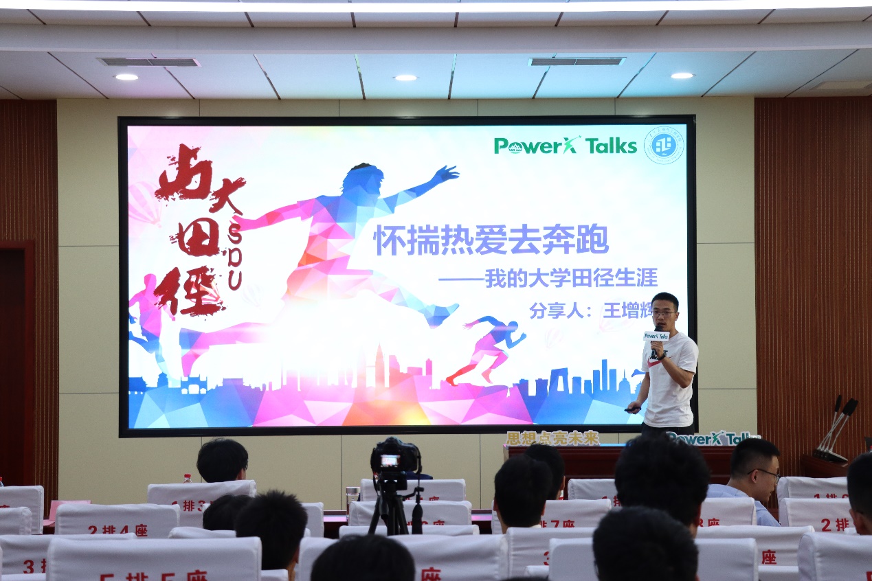 王增辉以"怀揣热爱去奔跑——我的大学田径生涯"为主题,向大家展示了他在田径中的独特见解和感悟。他回忆了自己在2017年冬季主动请求加入校普通生田径队的情景,并分享自己在2019年勇夺山东省大学生田径锦标赛男子甲组100米决赛冠军以及山东省第十六届大学生运动会男子甲组100米决赛冠军等成就的经历。接着,他从运动前的热身以及运动后的放松,给出了运动时的实用的建议。互动提问环节中,同学们积极参与,踊跃发言,针对交流会的内容分别向三位主讲人进行提问,主讲人对同学们的提问作出详细解答。