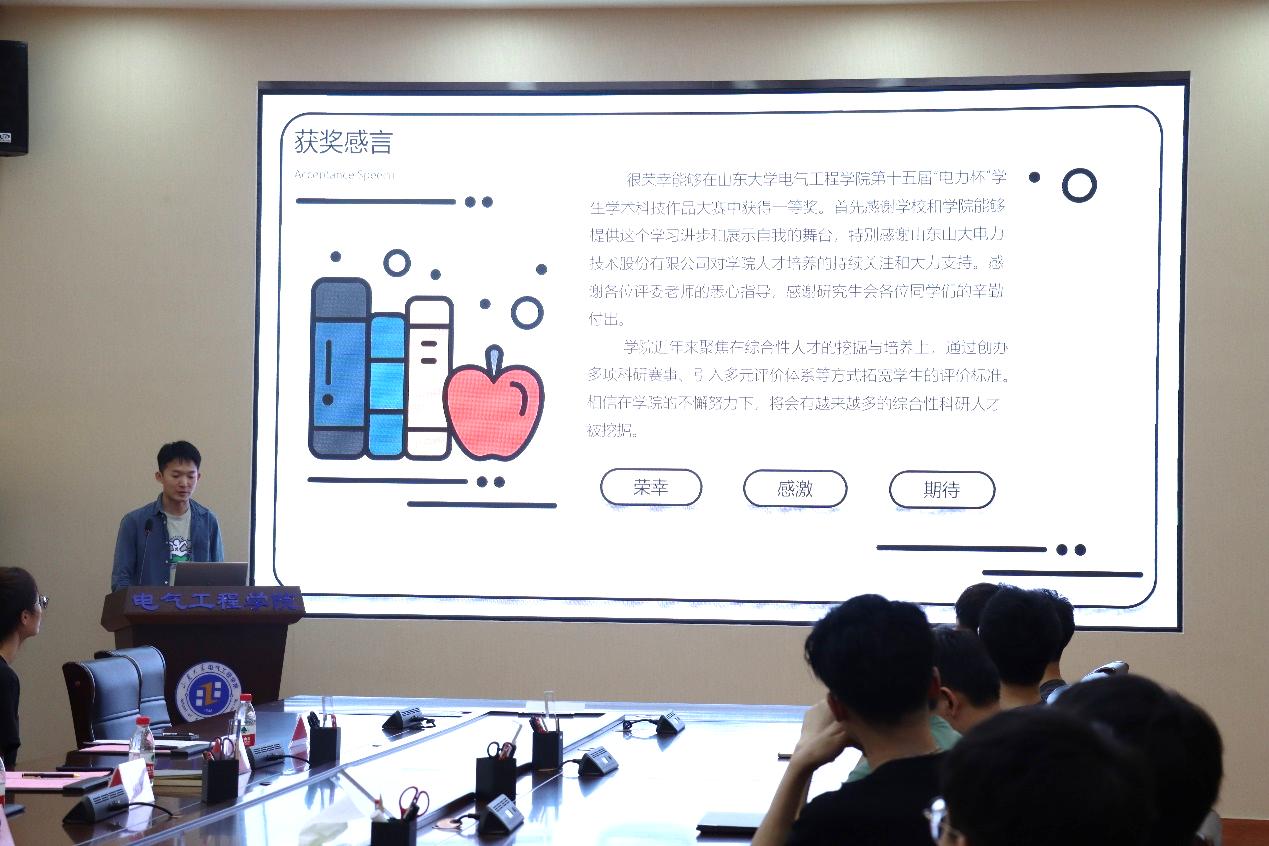 两组一等奖获奖团队代表分别分享了参加此次比赛的心得和经验并表示了对山大电力和学院的感谢。研究生组指定命题赛道的一等奖获奖团队代表张坤鹏从作品简介、制作过程以及经验分享三个方面向介绍了本次参赛的心路历程。研究生组自由命题赛道的一等奖获奖团队代表甘卓瓒从选题、创新、方法和分工合作四个方面分享了如何在自由命题赛道中抓住创新点并发挥团队优势的成功经验。