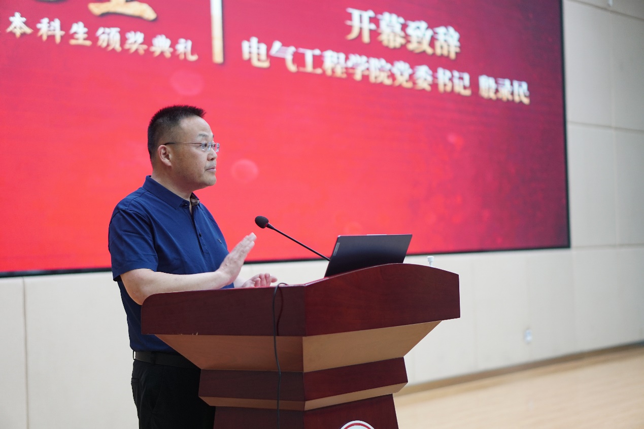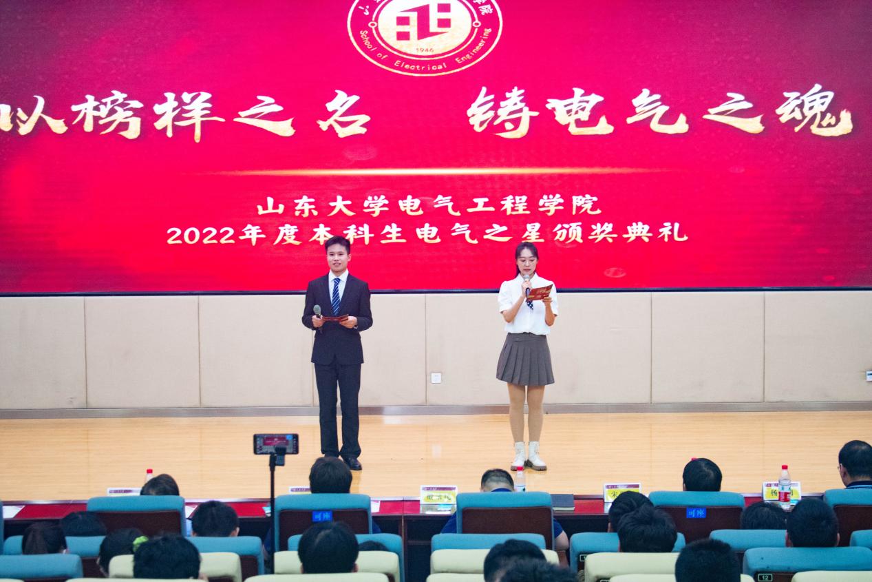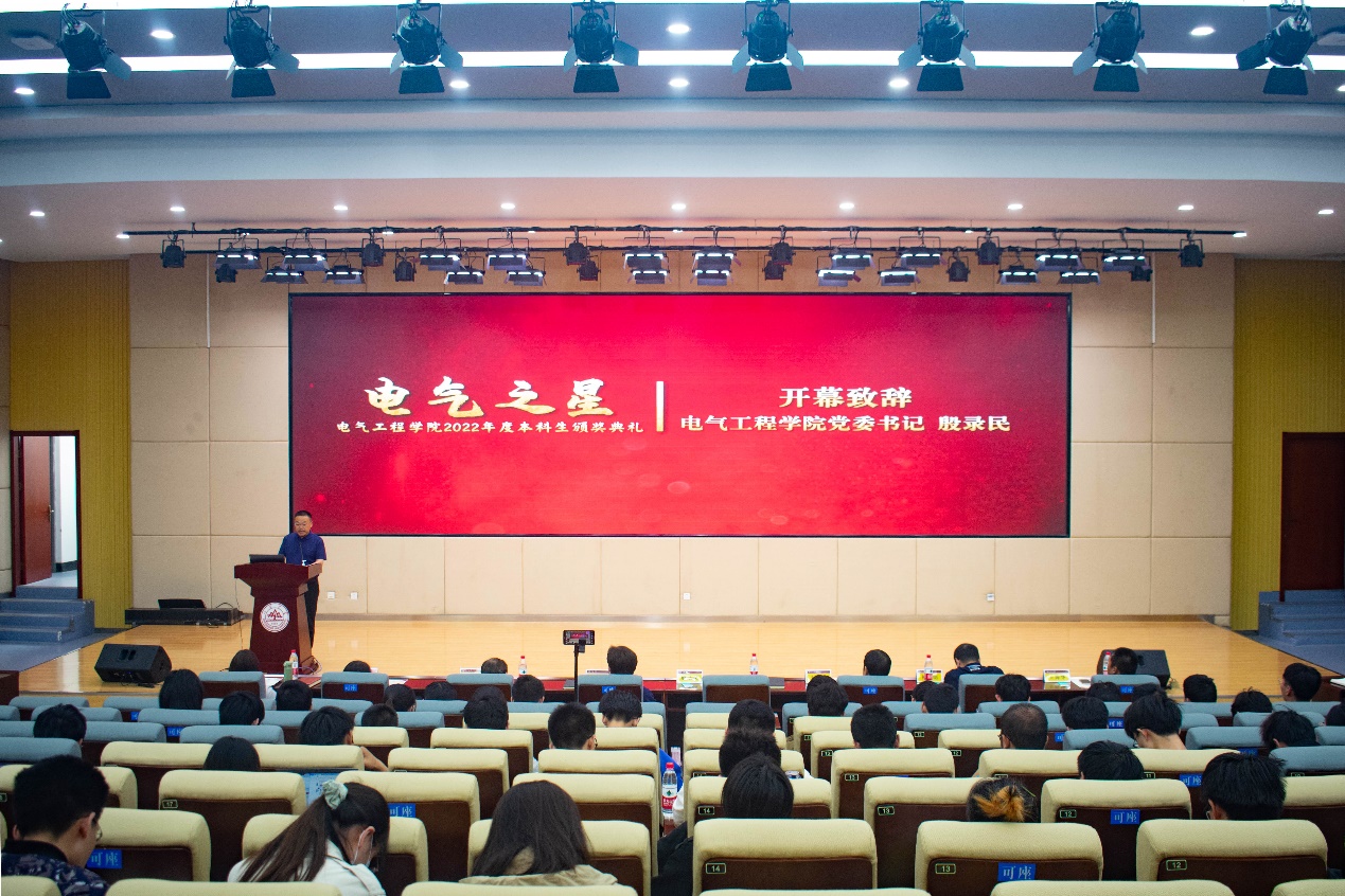 yl6809永利官网党委书记殷录民致开幕词。他表示举办“电气之星”颁奖典礼是对同学们所取得的成绩表示肯定和嘉奖,更重要的作用是发挥榜样的示范引领作用,向电气学子提出三点期望:一是坚定信念,提升素养。认真学习宣传贯彻党的二十大精神,深刻领悟“两个确立”的决定性意义,增强“四个意识”、坚定“四个自信”、做到“两个维护”,形成坚定的理想信念和政治定力。二是勤奋学习,崇实求新。弘扬学校的严谨学风,践行“爱国、励志、求真、力行”的要求,惜光阴、求真知、修品德,在知识学习中稳扎稳打、脚踏实地,为将来的科研和工作夯实基础。三是敢想敢做,勇做新时代追梦人。从一点一滴做起,把理想变为现实,让增长本领成为青春搏击的能量,让实践创新成为青春远航的动力,把个人梦融入山大梦、中国梦,成为有深厚家国情怀、勇于担当作为的电气学子。