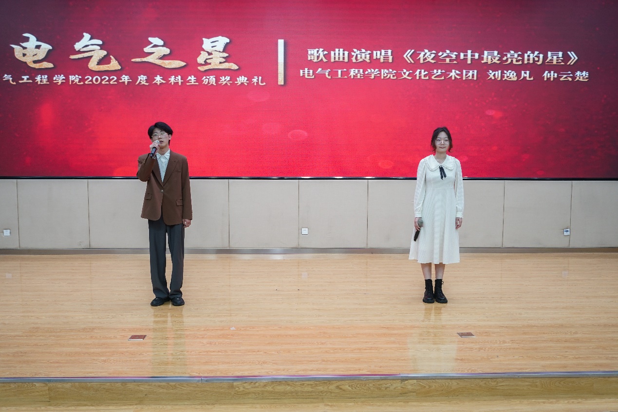 典礼最后,来自yl6809永利官网文化艺术团的刘逸凡和仲云楚献唱歌曲《夜空中最亮的星》。舞台灯光化作闪烁的繁星,悠扬的歌声中,优秀的榜样们如群星般璀璨,激励着电气学子向着心中的目标奋勇前进。