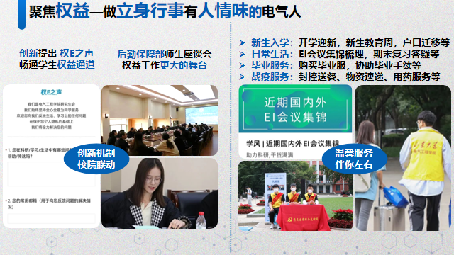 聚焦权益服务,倾听学生心声。电气研会始终以“全心全意为同学服务”为宗旨,践行“我为同学办实事”的准则,创新设置“权E之声”反馈平台,畅通学生权益通道;提供从入学至毕业的一站式日常服务,并在疫情时期主动担当,以封控送餐、物资速递等方式解同学燃眉之急;开展就业创业论坛、就业分享交流会等活动,添翼学生发展,为电气学子的成长之路保驾护航。