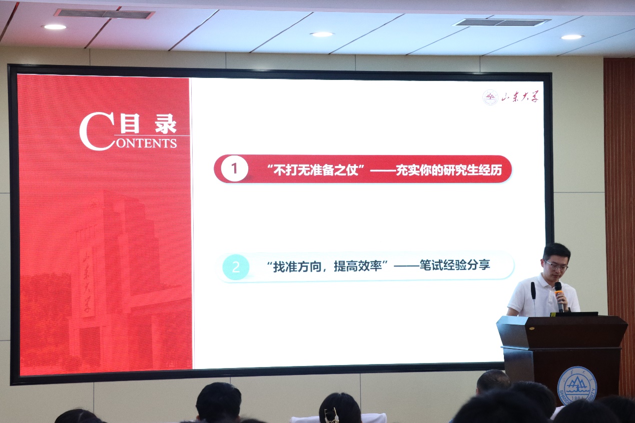 论坛伊始,董玉展以“面试经验”为主题,从读研经历分享、读研规划分享和就业经验分享三方面进行汇报。在读研规划方面,董玉展强调,要明确自己的奋斗方向是什么,并要清楚个人优势所在,明确自身目标,以科研为重,找到自身优势。他还从如何选择重点、突出亮点等方面介绍了简历撰写、面试自我介绍的相关经验。