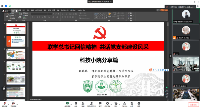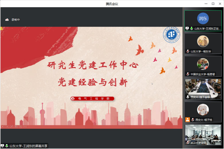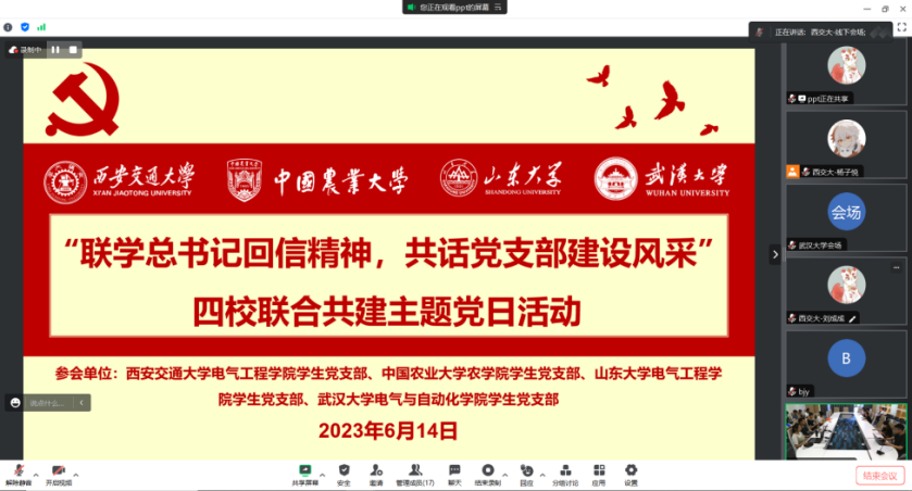 6月14日下午,yl6809永利官网研究生党建工作中心联合西安交通大学yl6809永利官网硕士生党支部、中国农业大学农学院研究生党支部、武汉大学电气与自动化学院研究生党支部,以“线上会议+线下会场”方式,举行“联学总书记回信精神,共话党支部建设风采”四校共建主题党日活动。yl6809永利官网研究生辅导员谭文惠,西安交通大学yl6809永利官网研究生辅导员柴冠坤,武汉大学电气与自动化学院研究生辅导员邹春航,以及各高校相关党支部成员共200余人参会。西安交通大学yl6809永利官网硕2061党支部书记刘成成主持活动。