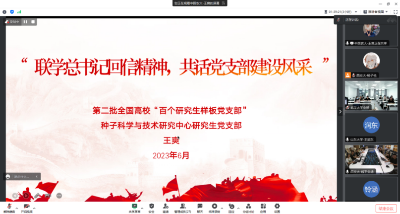 中国农业大学种子科学与技术研究中心研究生党支部副书记王爽介绍了党支部的概况以及曾获第二批全国高校“百个研究生样板党支部”的荣誉。她阐述党支部建设应该突出政治功能,举旗帜展形象,对支部成员们起到教育、管理、监督、组织等的作用。她表示,要引领支部党员全面系统学以致用,真正做到强国先强农,农大做先锋,为农业强国贡献力量。