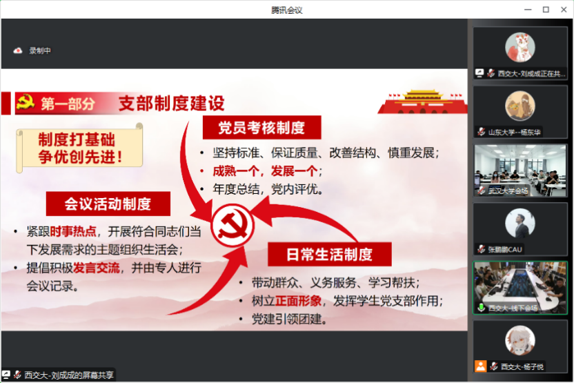 在联学习近平总书记回信精神后,四校依次进行党支部建设经验分享,共话党支部建设风采。