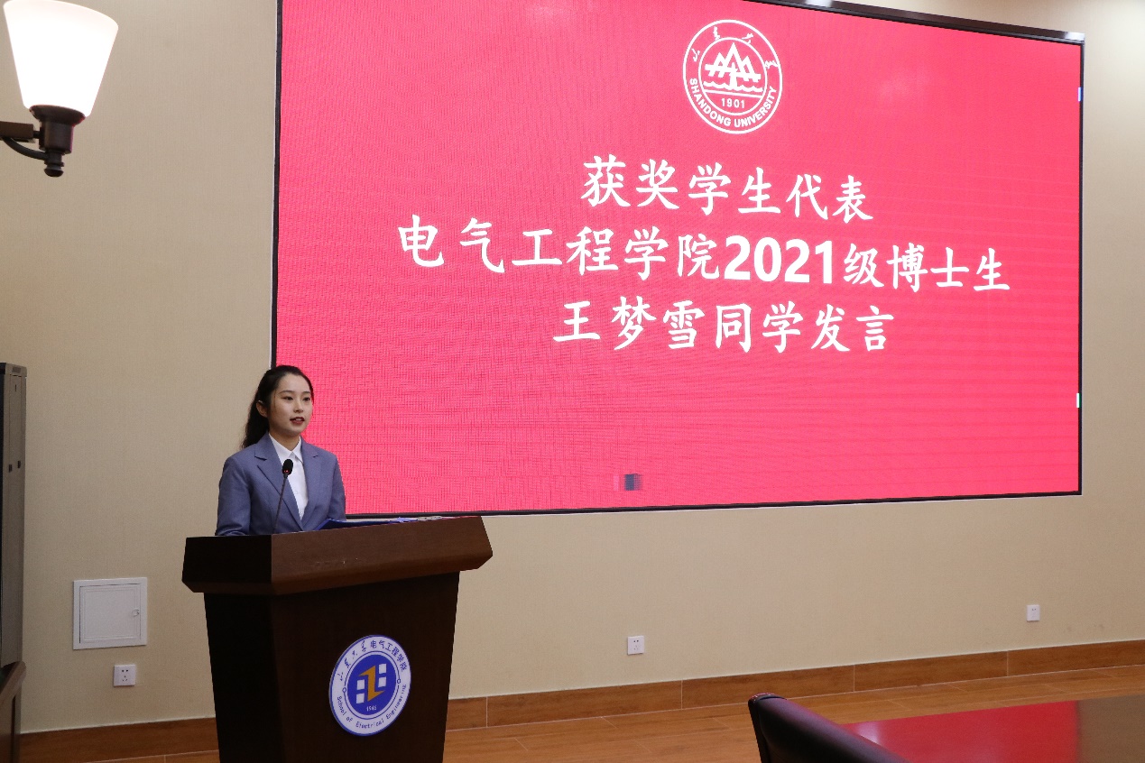 颁奖仪式中,张恒旭宣读了《山东大学关于表彰2023年度薛禹胜奖学金获得者的决定》,薛禹胜院士和朱德建副校长为获奖学生颁发获奖证书。薛禹胜奖学金获奖学生代表2021级博士生王梦雪发言,她代表所有获奖同学感谢学校的培养,感谢薛禹胜院士的捐赠善举,表示要牢记山东大学“为天下储人才,为国家图富强”的办学宗旨,认真学习,努力科研,勇攀学术高峰。