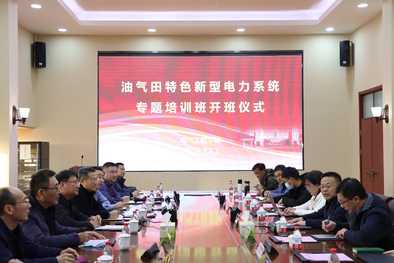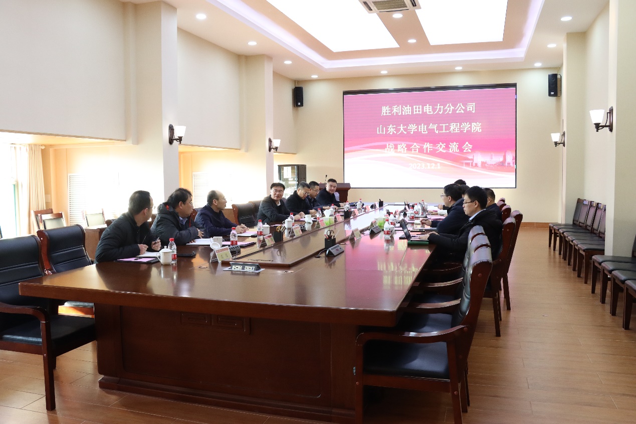 2023年12月1日,中国石化集团胜利石油管理局有限公司电力分公司总经理刘玉林、副经理荆峰等一行8人到访我院,参加“油气田特色新型电力系统”战略合作会议暨专题培训班开班仪式,学院党委书记殷录民、副院长叶华、院长助理孙媛媛、李常刚教授、董政副教授参加座谈。