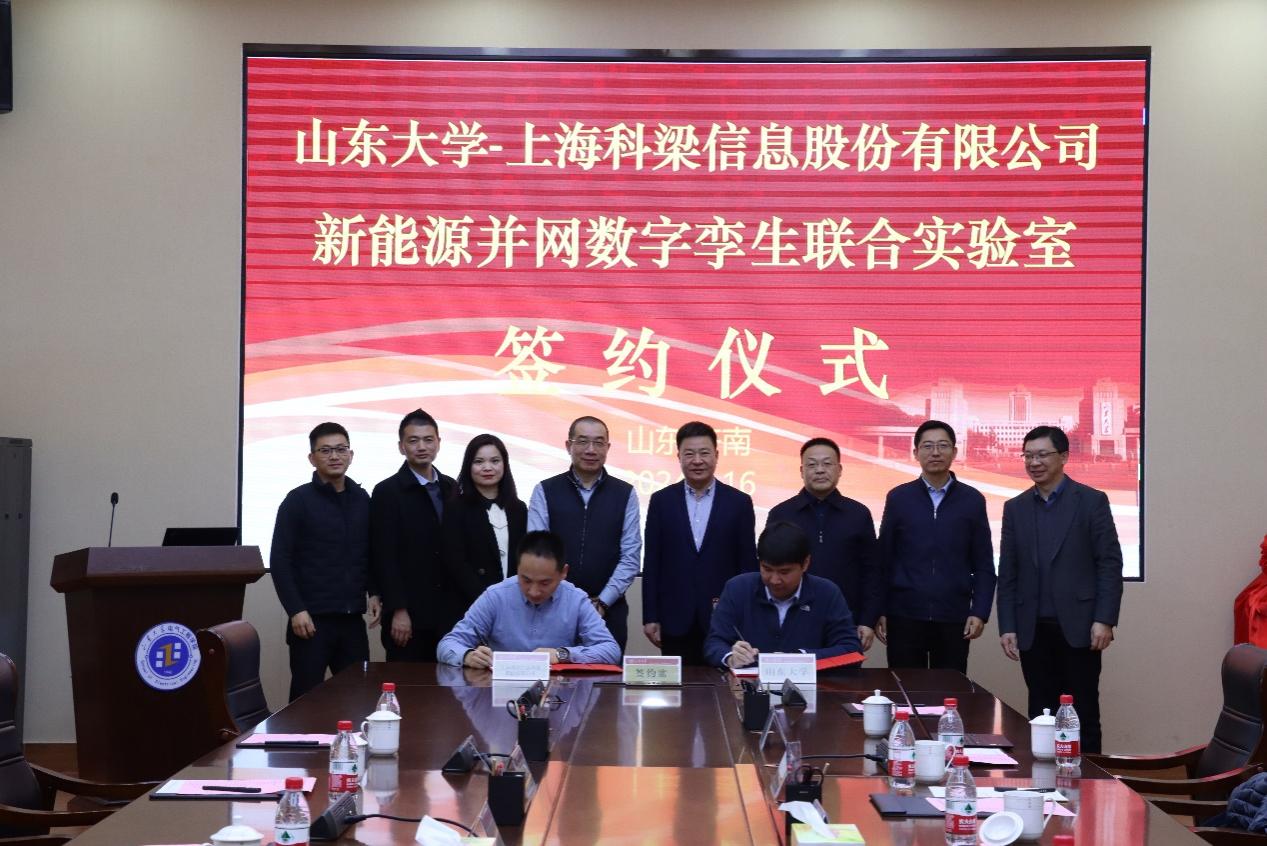 签约仪式上,赵浩然、李鸿彪分别代表双方签署了合作协议,朱德建与桑苏明为“山东大学—科梁信息新能源并网数字孪生联合实验室”揭牌。