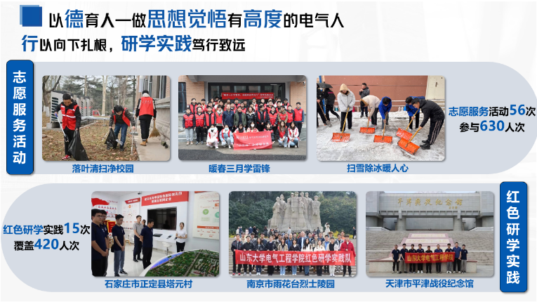 做思想政治的引领者。电气研会秉承“领航思政,助力成长”的工作初心,以功能型团支部为阵地,开展一系列时效强、形式新、趣味广的专题学习与主题教育,开创新时代思政学习新局面;组织多次志愿服务活动与红色研学社会实践,立好青年学生的思政风向标。