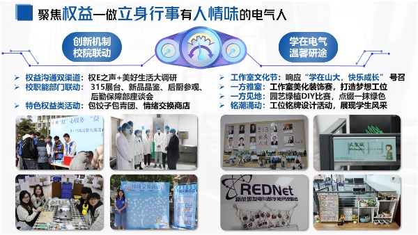 做桥梁纽带的守护者。电气研会秉持“领航沟通,打造桥梁”的工作方针,健全“同学诉+研会询”双向交流机制,并开展“全方位、多形式、高质量”的权益活动。组织后厨参观与新品品鉴等餐饮体验活动、搭设315权益展台,助力提升校园生活品质;发起首届工作室艺术节,打造个人梦想工位,营造电气家文化。各类权益举措共同保证诉求有门、发展有路、困难有帮,三管齐下,做同学身边的知心人。