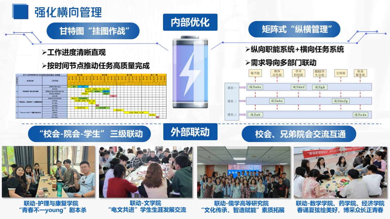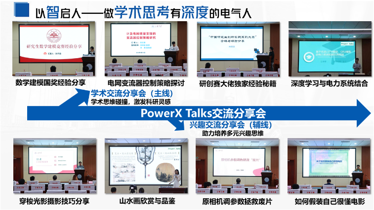 做成长成才的赋能者。电气研会坚持“领航成长,助力成才”的工作重心,构建学术促进、就业引领、心灵护航、企业实践、骨干培养相结合的五位一体工作布局。打造“PowerX Talks”学院品牌交流分享会,拓宽电气学子学术视野;深入剖析就业需求,定期开展就业推进会;开展各类心理健康讲座并开设情绪交换商店,提升朋辈群体心理互助能力;组织多次电力一线企业实践,添翼学生发展;优化骨干培养机制,打造一支高效运转的精英队伍,为电气学子的成长之路提供全方位的支持和帮助。