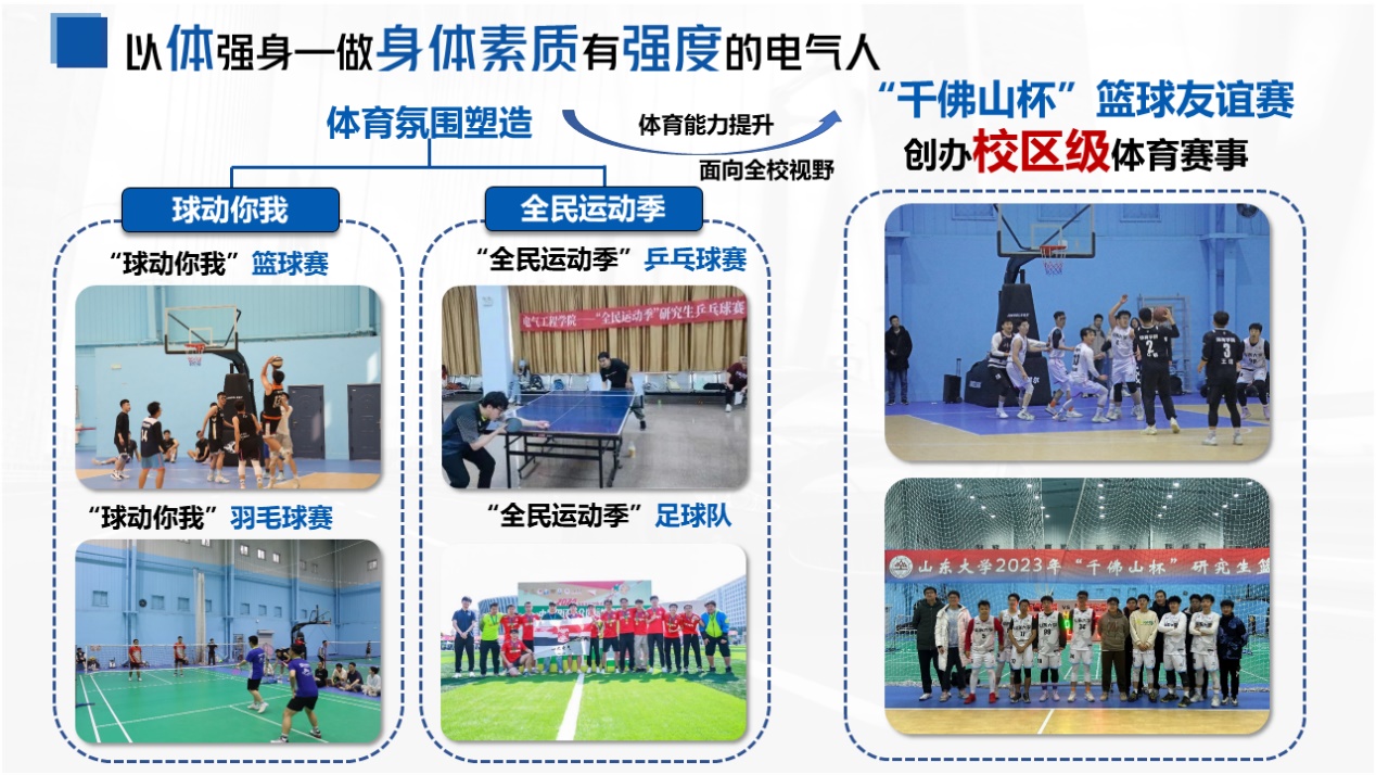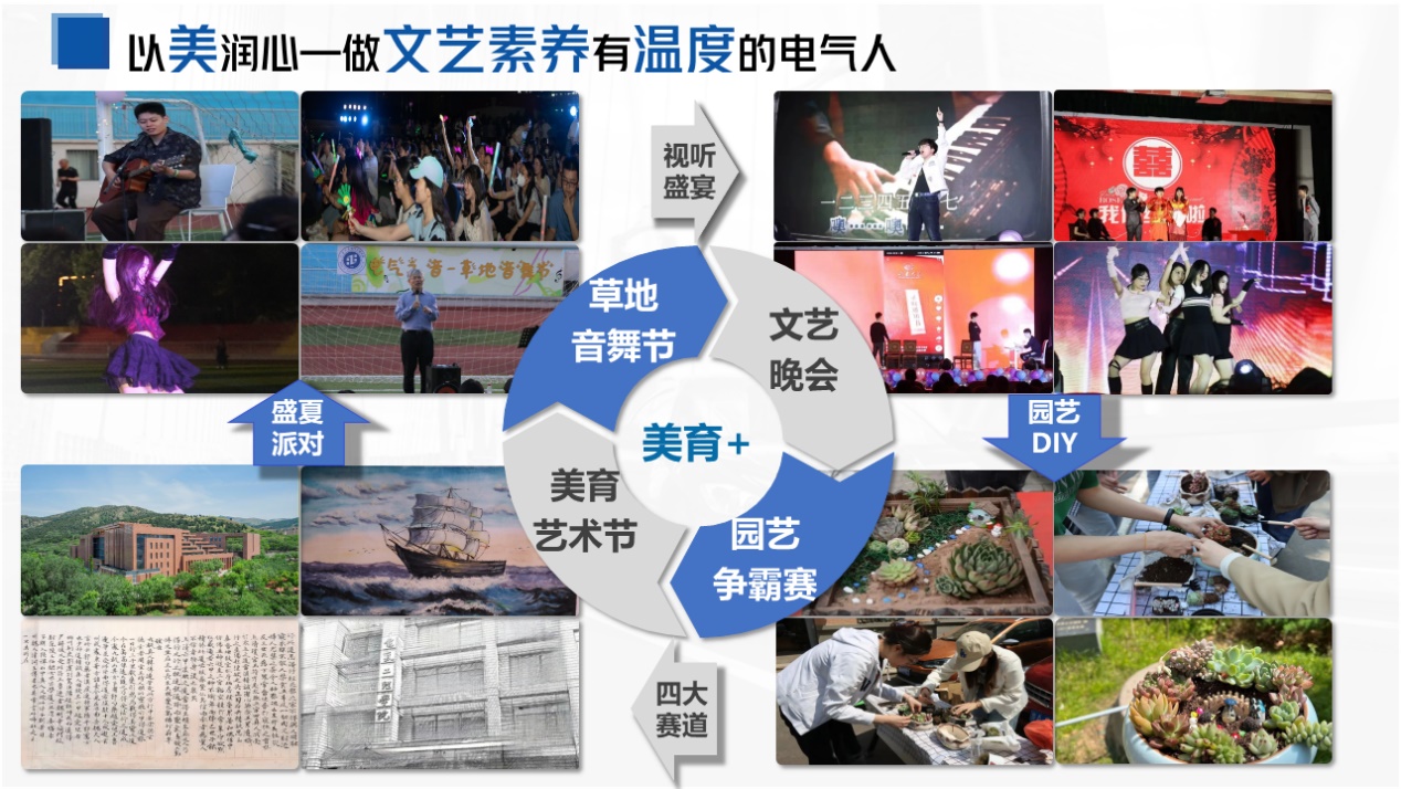 做校园文化的缔造者。电气研会牢记“领航文化,共筑梦想”的工作使命,以五育并举为指引,打造一系列形式新颖、喜闻乐见的品牌活动。开展草地音舞节等文艺盛会,彰显山大文化的独特魅力与高度;牵头发起千佛山校区首届篮球赛—“千佛山杯”篮球友谊赛,打造属于千佛山校区的亮眼体育运动名片;筹建山东大学科技馆宣讲团,并举办首届“宝藏山大”科技馆开放日,与校史馆宣讲团、博物馆宣讲团共同构建山大文化宣讲矩阵;推出包饺子、揉青团等系列食堂体验活动,提升校园文化氛围,为学校繁荣发展贡献青春力量。