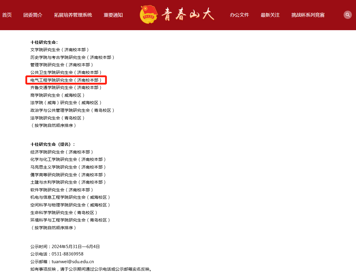 2024年5月30日,山东大学2023-2024年度院级学生会“我为同学做实事”年度项目交流展示暨“十佳院级学生会组织”评选工作落下帷幕。经过材料申报、项目展览、报告评审、线下答辩等环节,我院研究生会再续荣誉,再次荣获山东大学“十佳研究生会”荣誉称号。