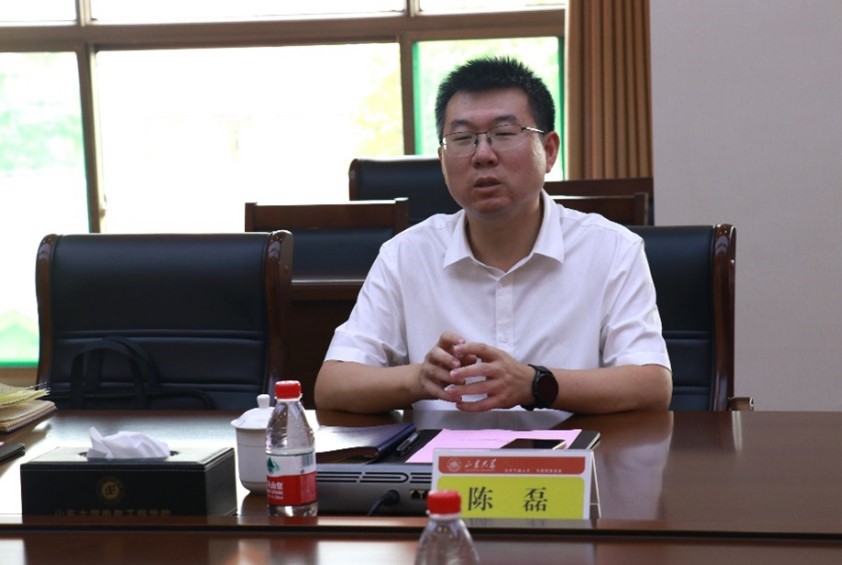 陈磊对学院的热情接待表示感谢,并介绍了公司的发展概况与业务范围。他指出,山东发展新能源有限公司作为集团内部的新兴力量,自今年5月份成立以来,聚焦新能源投资、建设和运营,致力于推动新能源技术创新与应用。他表示,期待未来在人才培养、科技成果转化和党建团建等方面与学院加强合作,共同推动新能源产业快速发展。