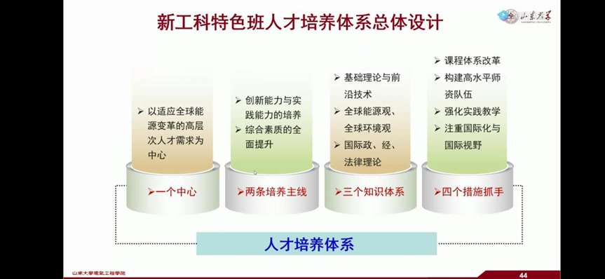 之后,张恒旭从学科发展与历史沿革、学院师资队伍、平台基础和特色以及人才培养理念等方面对学院基本情况进行了展示。在人才培养方面,他结合学院科研获奖情况与科研成果转化效果阐释了科学研究带动人才培养的宗旨。在人才培养投入方面,张恒旭表示,学院以学生为中心,在投入大量科创基金的同时立志打造面向本科生的创新实验室。随后,他对山大yl6809永利官网特有的全球能源互联网特色班进行了介绍。指出了全球能源互联网特色班的办学定位,并就其内涵、特色建设路径与人才培养体系进行了全面深入的阐述,令广大学子对此有了更深刻的了解与认知。