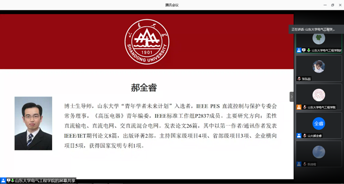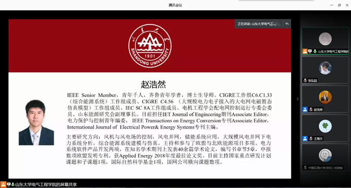 21日上午8:30,夏令营第二天的学术报告在线上举办,此次学术报告在邀请了电力电子与电力传动研究所孙媛媛老师和可再生能源与智能电网研究所郝全睿老师外,还邀请了山东省电科院刘洪正院长作为特邀嘉宾,会议由学院研究生会成员姜心怡主持。孙媛媛老师介绍了自己的科研团队的课题研究与研究生培养相关内容。刘洪正院长介绍了平价上网背景下的风电发展开发与展望。郝全睿老师简要的介绍了MMC换流站的小信号建模和分析的基本原理。经过两次学术报告,各营员受益匪浅,不仅使各营员充分了解老师们从事的科研方向,也对山东电科院有了初步的认识和了解。