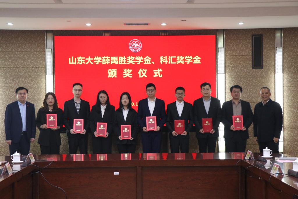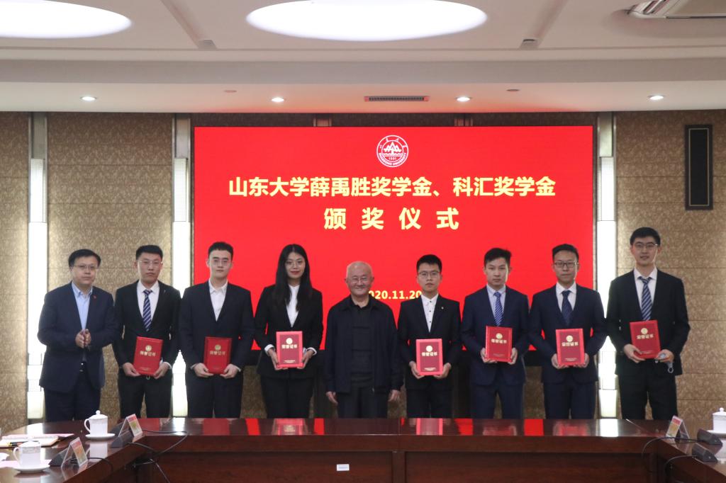 颁奖仪式中,刘相宜宣读了《山东大学关于表彰2020年度薛禹胜奖学金获得者的决定》,薛禹胜院士和王君松副书记为薛禹胜奖学金获奖学生颁发了获奖证书。高弟宣读了《山东大学关于表彰2020年度科汇奖学金获得者的决定》,徐丙垠教授和王君松副书记为科汇奖学金获奖学生颁发证书。薛禹胜奖学金获奖学生代表李冠群、科汇奖学金获奖学生代表巩文洁分别发言,代表所有获奖同学感谢学校的培养,感谢薛禹胜院士、徐丙垠教授的捐赠善举,表示要牢记山东大学“为天下储人才,为国家图富强”的办学宗旨,认真学习,努力科研,争取早日成材。
