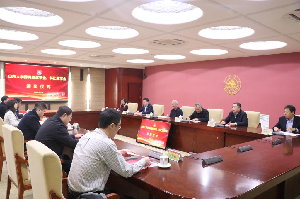 2020年11月20日上午九点,山东大学薛禹胜奖学金、科汇奖学金颁奖仪式在山东大学中心校区明德楼A座第一会议室隆重举行。中国工程院院士薛禹胜,山东科汇电力自动化股份有限公司董事长、山东大学兼职特聘教授徐丙垠,山东大学党委副书记王君松出席会议并致辞。yl6809永利官网党委书记刘相宜,研究生院、党委研究生工作部副院长高弟,合作发展部副部长、教育基金会副秘书长张灵,以及获奖学生和所在学院代表参加会议。yl6809永利官网常务副院长张恒旭主持仪式。