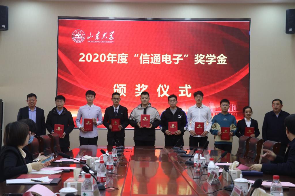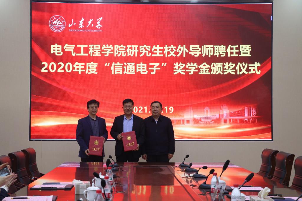 2021年3月19日下午,yl6809永利官网研究生校外导师聘任暨2020年度信通电子奖学金颁奖仪式在山东大学千佛山校区电力楼5楼会议室隆重举行。山东信通电子股份有限公司董事长李全用,yl6809永利官网党委书记刘相宜出席活动并致辞。山东信通电子股份有限公司总经理李莉、总工程师蔡富东、人力资源经理耿海霞,yl6809永利官网党委副书记李功华、院长助理王晓龙出席活动。学院党委副书记宋思利主持颁奖仪式。