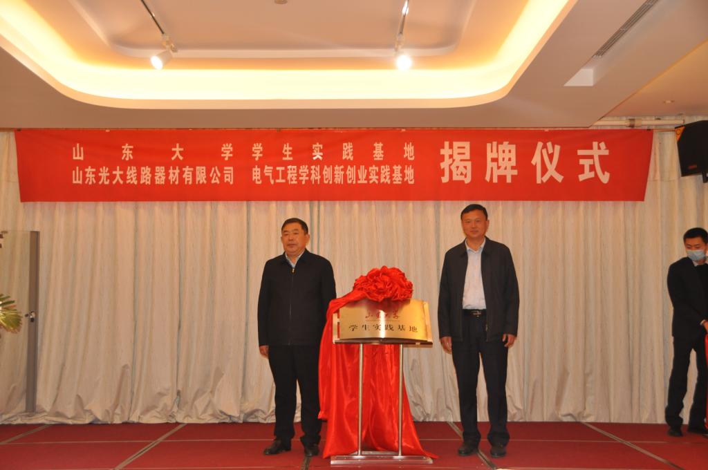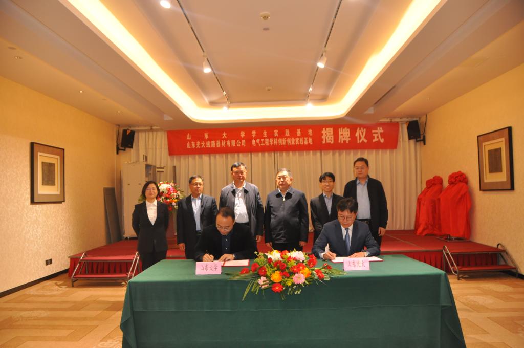 仪式上,校企双方代表签署合作协议;刘晓伟代表济宁市经济技术开发区致辞,他简要介绍了济宁市经济技术开发区近年来的发展概况和发展规划,对两个实践基地落户济宁经开区表示热烈欢迎,对山东大学在开发区经济建设中给与的支持和帮助表示衷心感谢。张辉在致辞中对山东光大线路器材有限公司的发展历程做了简要介绍,他表示,科学技术是第一生产力,公司非常重视科技和人才的储备与发展,此次协议的签署和两个基地的成立,搭建了校企合作的桥梁和平台,为企业的产品研发和创新发展注入活力,公司将以此为契机,不断加大研发投入,增强科研实力,进一步提升产品质量和市场竞争力,促进企业发展再上新台阶。