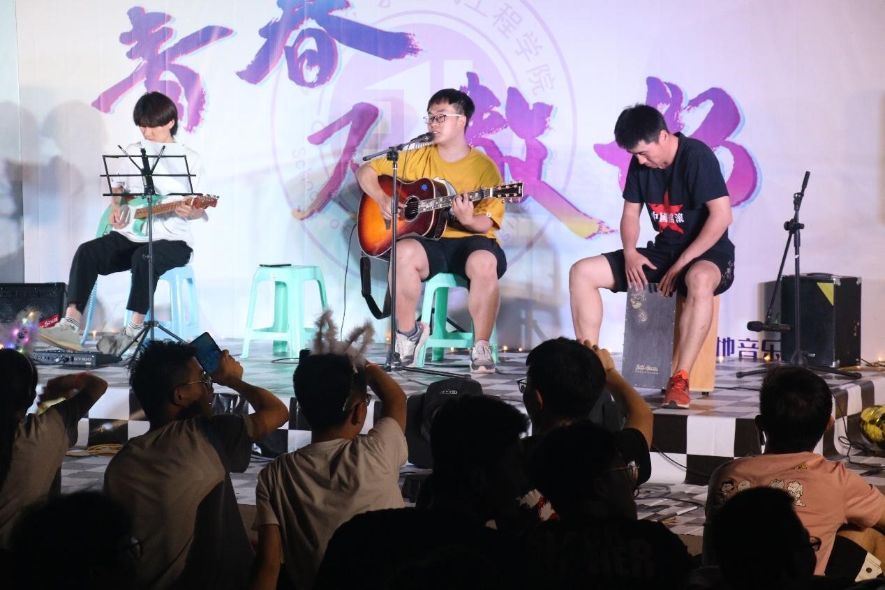 之后是由2021届毕业生鲍鹏带来的吉他弹唱。平凡却不平庸,每个人都有存在的意义,哪怕我的人生平平淡淡,我也会一直走下去,走自己的路,义无反顾,一首《平凡之路》唱出了同学们的心声。成都想必是很多人梦想中的城市,在成都的街头哼唱着《成都》,把手揣进裤兜,坐在小酒馆的门口,就这样一个人静静的走着,消失在灯光的尽头,就这样走着,走完自己选择的人生。做个如《蓝莲花》一般自由的人,不清高,不孤僻,不低俗,不虚伪,但清渺、高远、独立、宁静,而且如此真实。青春无悔的日子,总是让人难以忘怀,难以割舍。那就去做一颗《夜空中最亮的星》吧,照耀整片天空。