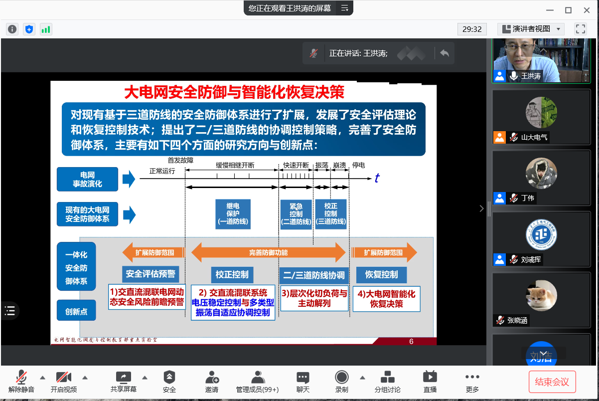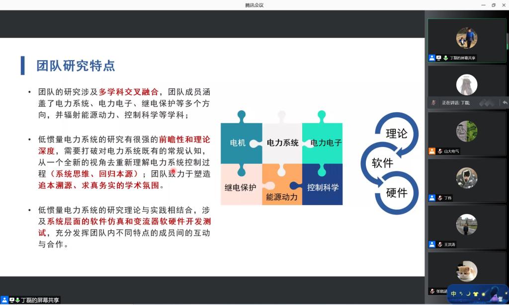 19日下午13:30,有四场学术报告在线上举行,分别邀请了复杂电网安全防控与智能恢复科研团队的王洪涛教授、电力系统经济运行科研团队的王孟夏老师、新形态电网保护与控制科研团队的邹贵彬教授以及低惯量电力系统控制科研团队的丁磊教授为夏令营同学介绍团队情况。王洪涛老师就大电网安全防御与智能化恢复决策方面介绍了自己的科研团队的课题研究与研究生培养相关内容。王孟夏老师针对自己的研究介绍了电力系统电热协调理论与应用,并对该课题下科研项目及成果做了简单介绍。邹贵彬老师重点从近年研究成果、主要研究方向与科研平台方面介绍了团队的科研实力与研究情况。丁磊老师从团队成员、团队研究及特色以及团队研究生培养体系三方面介绍了团队情况,并欢迎优秀学子加入团队。