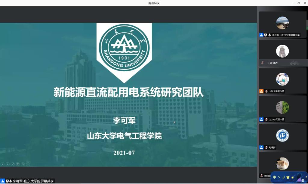 20日上午8:30,夏令营第二天的学术报告在线上举办,此次学术报告邀请了新能源中低压直流配用电系统科研团队的李可军教授、智慧能源与海工驱动科研团队董政老师以及特高压输变电技术与装备科研团队的何东欣老师为大家介绍团队情况以及科研成果。李可军老师介绍了团队研究基础与科研进展,着重介绍“直流用电+泛在物联”的研究特色,董政老师从团队聚焦与规划、基础与支撑两方面重点介绍了团队的实验与科研能力,何东欣老师介绍了团队组成及代表性科研成果,着重以“电-热-机械多物理场耦合作用下换流变压器绝缘劣化机理研究”这一重大课题入手介绍了团队的科研情况。