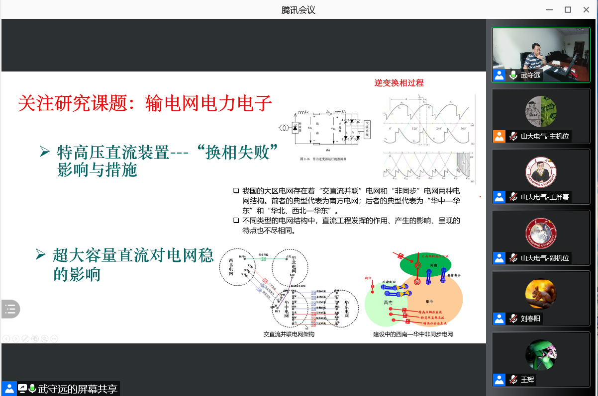 19日上午10:00,夏令营系列学术报告在线上正式开始。此次学术报告邀请了学院12个团队的优秀教师为大家介绍团队科研成果,会议由学院研究生会成员主持。主持人在学术报告开始前对每位老师进行了介绍,帮助同学们更好的了解老师们的信息。第一场报告主讲人为智能电网柔性技术与装备团队的王辉教授与武守远教授,他们详细介绍了团队的成员配置以及团队科研主要内容,让同学们对于输电网电力电子方向的课题有了一定了解。