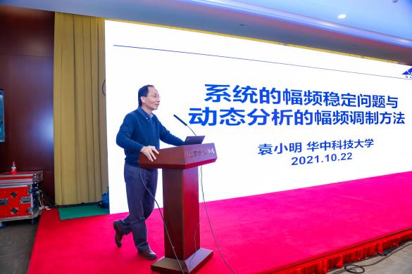 袁小明教授为大会带来第一个报告,题目为“系统的幅频稳定问题与系统分析的幅频调制方法”。首先,报告指出幅值和频率稳定是电力系统运行的基本目标,并以同步发电机与电力电子并网设备为例说明不同传输特性决定了对设备幅频支撑能力的不同需求。然后通过分析内电势幅频的形成机制与时变本质,指出基于相量法和阻抗法的常规动态分析方法不再适用于电力电子化电力系统。最后,报告给出连分幅频调制是交变信号演化的统一本质,而连分幅频调制方法是平衡点和非平衡点上系统动态分析的一般方法的结论。
