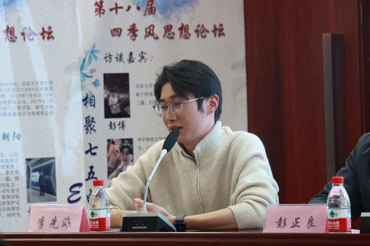 12月10日晚七点,由yl6809永利官网研究生会学术科创中心主办的“相聚七五电院,E路职引未来”第十八届“四季风”青年师生思想论坛在电力楼四楼报告厅成功举办。本次论坛特别邀请到青年学者金朝阳和七位本院优秀硕士毕业生彭正良、朱希松、刘晓艺、彭博、银泽一、李先海、周颖健为座谈嘉宾,以线上线下结合的访谈形式就同学们所面临的学习、科研、就业等方面的问题展开交流讨论,学院党委副书记宋思利、研究生办公室主任宋济平出席本次论坛,由学院研究生会学术与科创中心李书凯同学主持。