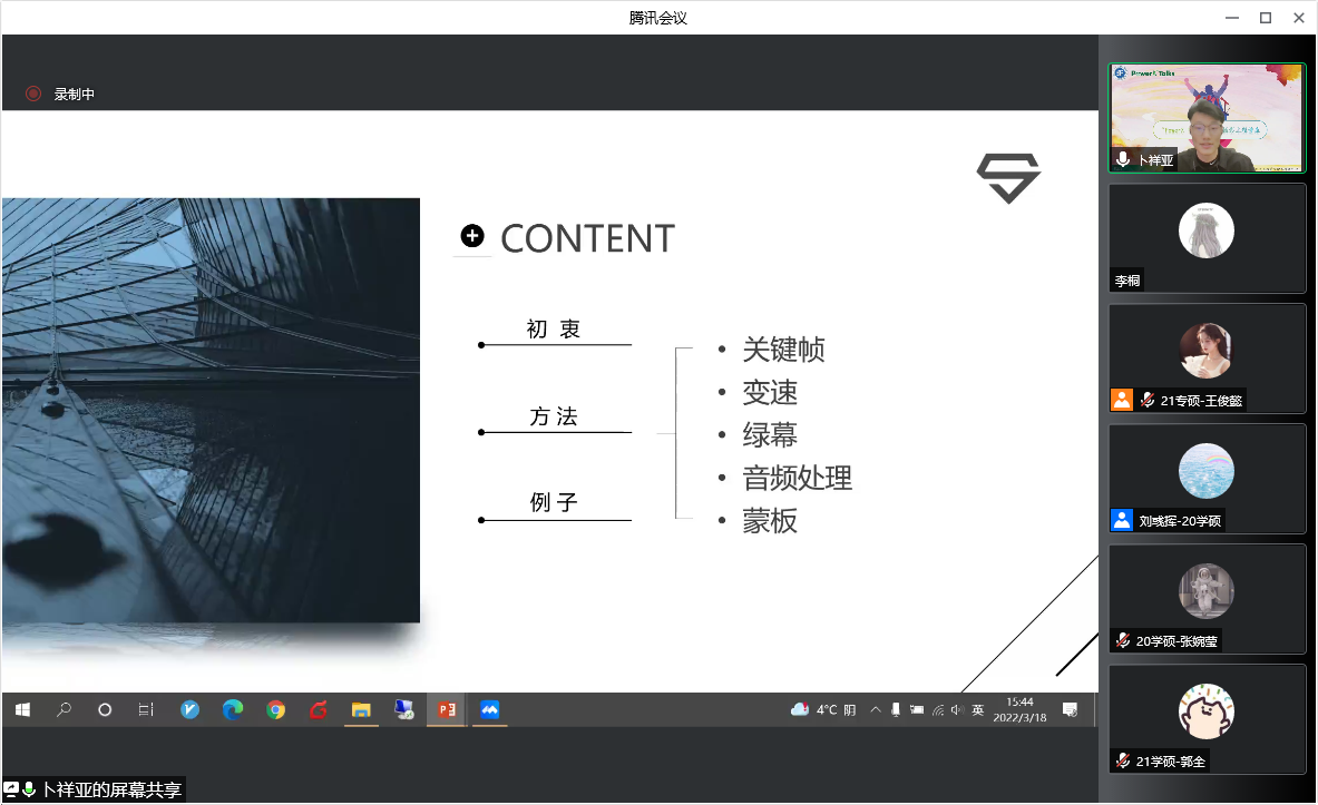 讲座第二部分,卜祥亚以“剪辑日常-用最简单的方式记录生活”为主题,讲述如何用最简单的方式记录生活,从初衷、方法、例子三方面对短视频拍摄与剪辑进行了分享。他从自己的妈妈、关注博主以及他自己本身拍摄短视频的初衷进行了对比,告诉每个人拍摄短视频的出发点不同,但都可以从中找到自己的快乐。随后卜祥亚具体对照视频讲解了关键帧、变速、绿幕、音频处理、蒙版等具体操作方法,并展示实际剪辑出来的效果以加深同学理解。