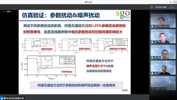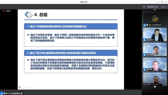 山东大学叶华教授做了“大规模时滞电力系统振荡分析与控制关键技术”为主题的报告,针对考虑通信时滞影响的大规模电力系统,在低复杂度建模技术、特征值准确计算方法、大规模系统的特征值高效计算关键技术、特征值计算软件开发和广域阻尼控制器参数优化整定方面的研究成果。