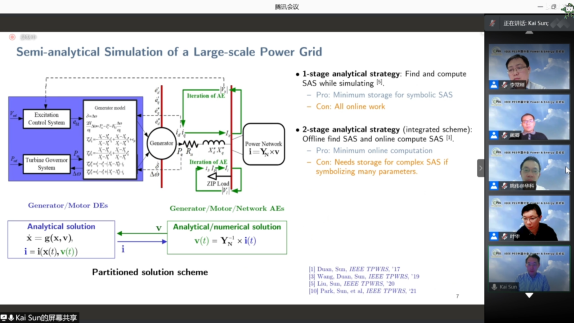 随后,美国田纳西大学孙凯教授做了“Faster-Than-Real-Time Stability Assessment and Control for a More Resilient Power Grid”为主题的报告,分享了其课题组在近5年在基于半解析方法的大规模电力系统暂态稳定超实时仿真技术和基于非线性模态分解的暂态稳定性分析方面的取得的一系列理论成果。半解析方法,可以实现大步长暂态稳定仿真和10-100倍的加速比;非线性模态分解,可以实现小干扰稳定和暂态稳定性在统一框架下的分析。