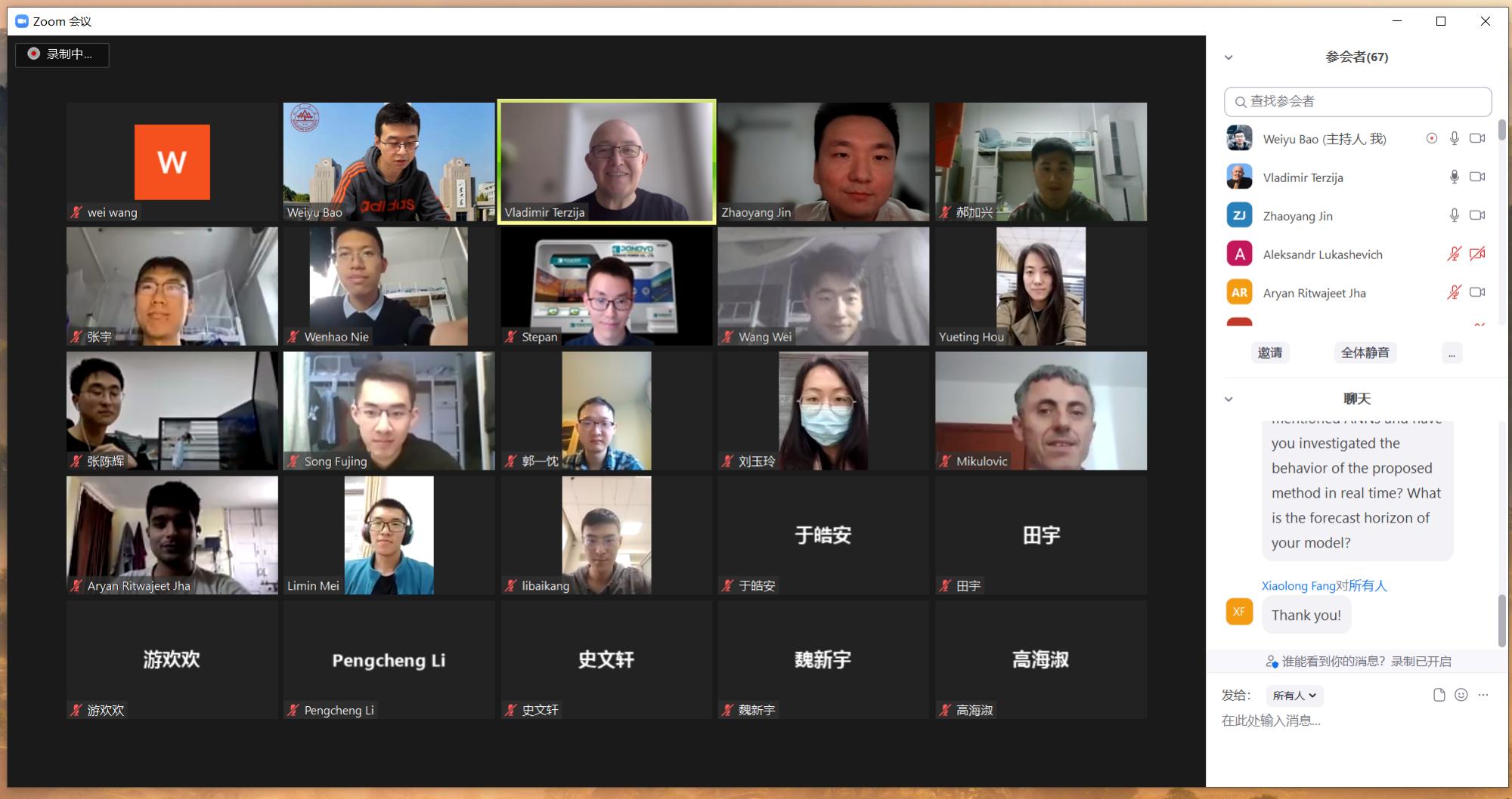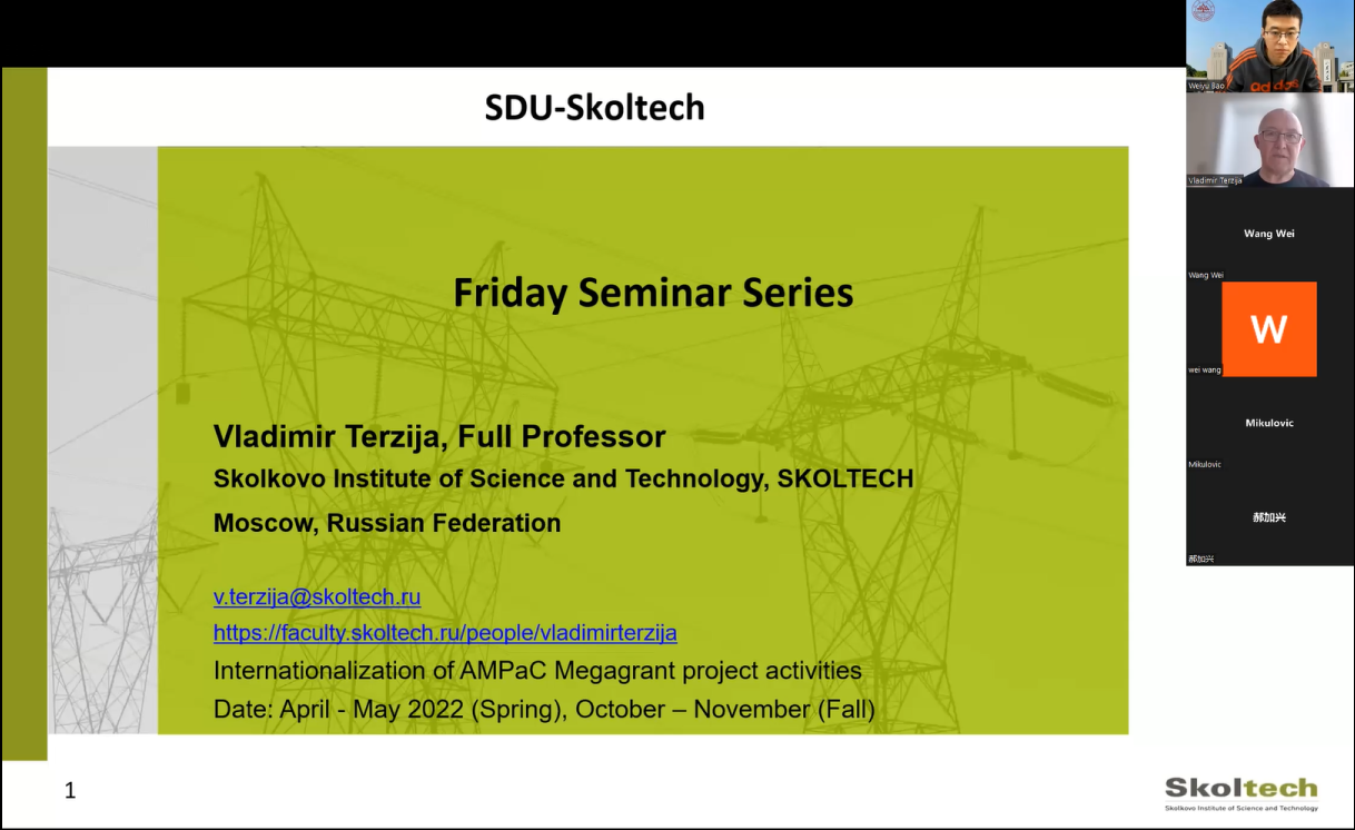 学术报告开始前,论坛主席兼主持人、俄罗斯Skoltech教授Vladimir Terzija首先作了欢迎致辞并介绍了本论坛的基本情况。随后,我团队金朝阳老师作了主题为“Distribution System State Estimation Based on Machine Learning”的专题学术报告,并与参会师生进行了深入的交流讨论。最后,Vladimir Terzija教授进行了总结发言。