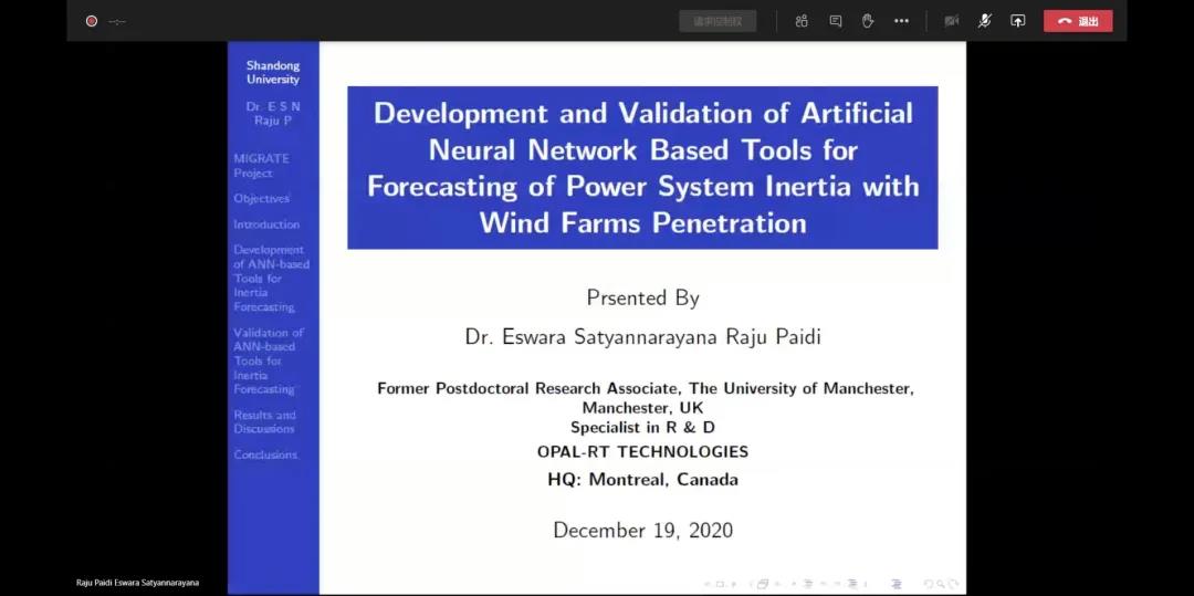2020年12月19日,低惯量课题组顾问Vladimir Terzija教授邀请印度专家Dr. Raju做关于惯量预测的线上报告。