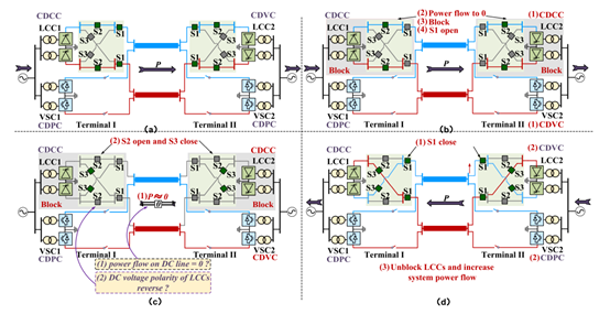 图2 控制策略的潮流反转控制(a)正常运行 (b)潮流逆转控制(步骤一) (c)潮流逆转控制(步骤一) (d)潮流反转控制(步骤III)