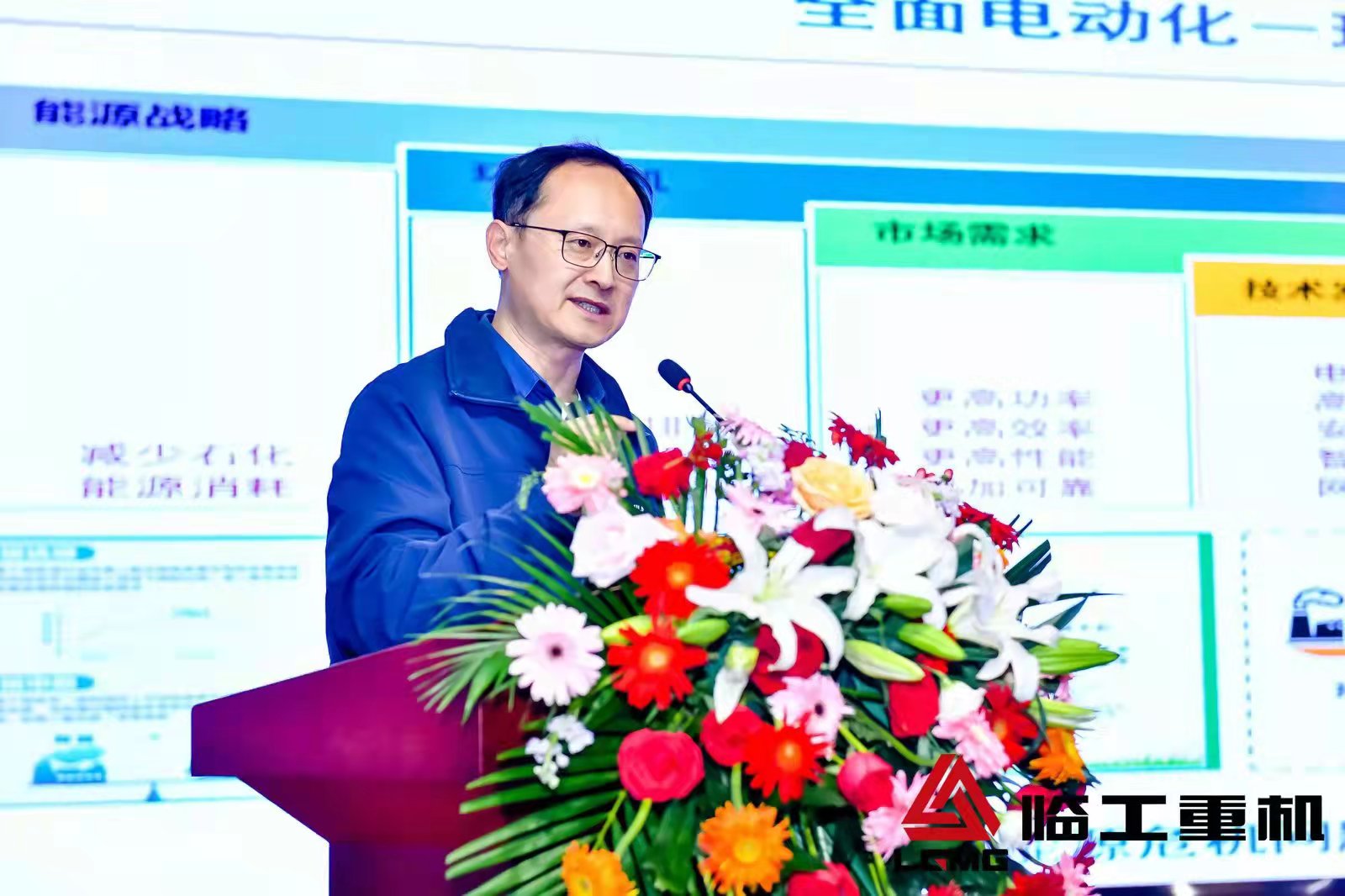 图1. 王长江教授在临工重机新产品发布会上汇报“矿用重载车辆电驱动”课题组的研究成果。