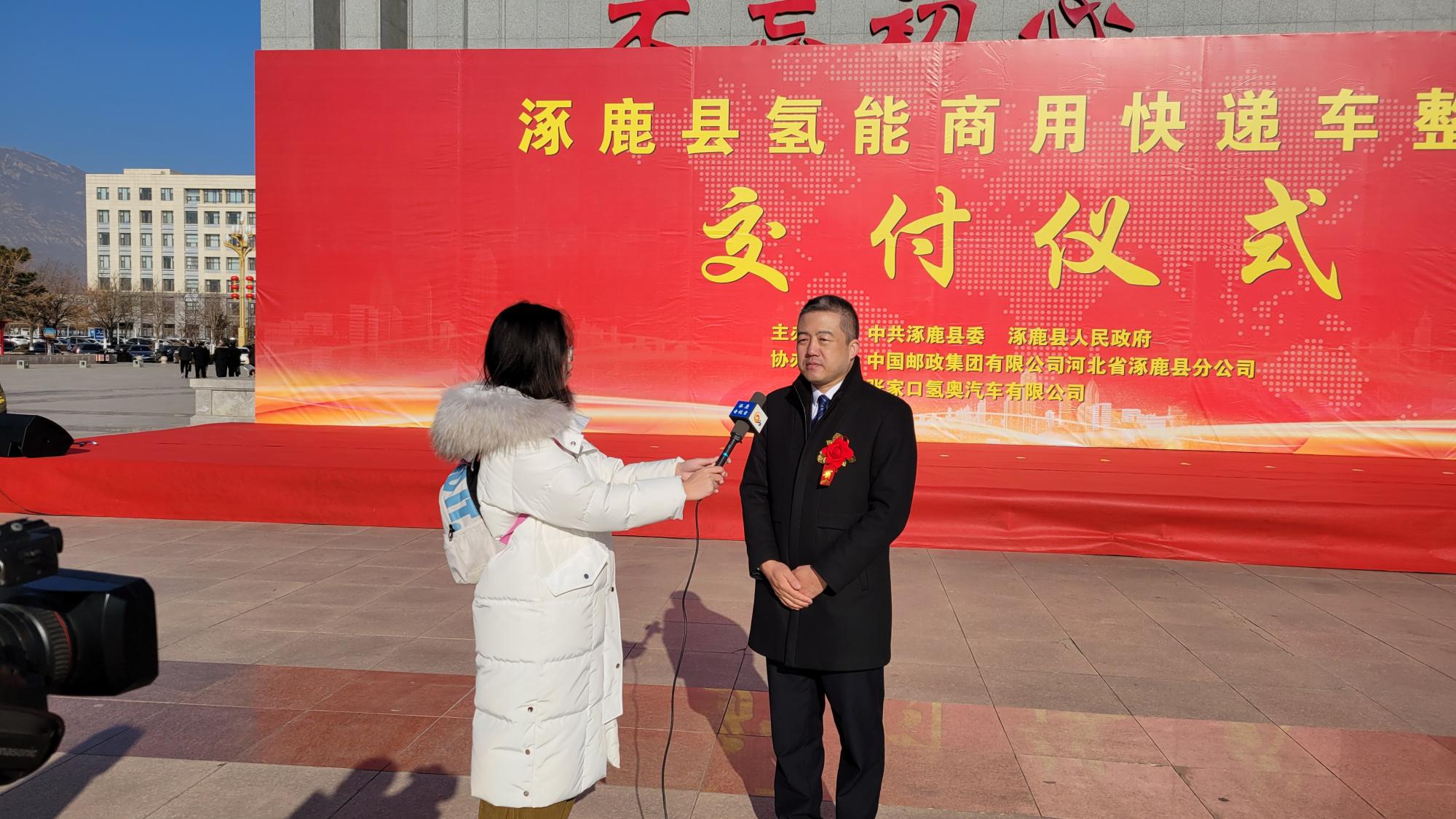 图3.成果转化企业奥特姆新能源汽车祁鹏董事长向冬奥和氢能示范城市张家口市交付首批试运行的氢能快递车。